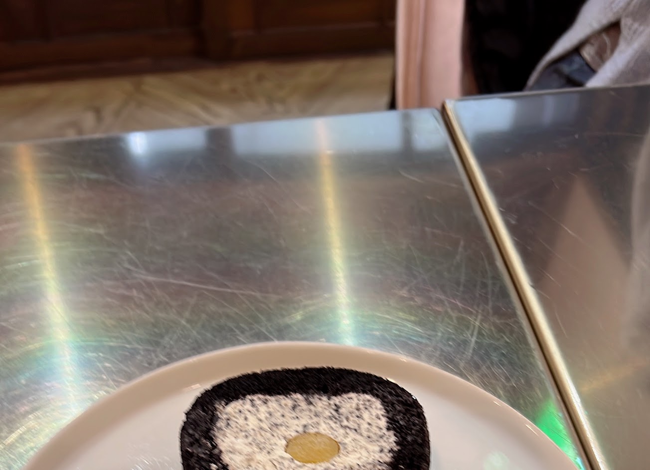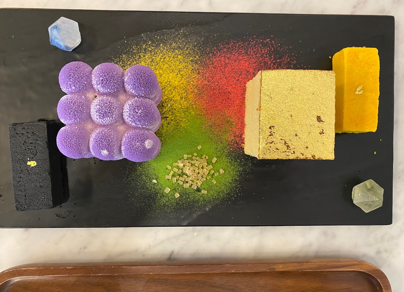 我最最最想吃+拍照的就是宛如藝術品的「幾何慕斯蛋糕」!目前內用的小幾何慕斯蛋糕有四種款:貴妃(紫色,我最想拍的,但我不知道要預訂,所以沒吃到?)、墨客(黑色)、白日夢、小胭脂(愛心?)。