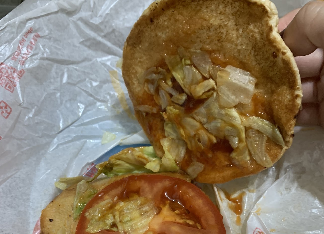 其實平常盡量不會在晚上購買,尤其是9:00以後,因為常常踩到雷,餐點的品質很糟糕的頻率很高。今天晚上貪圖方便,買了嫩煎雞腿堡,結果真的沒有讓人失望,整個是苦的,打開一看很多部位是焦掉的!感覺像是重複煎過,而且又乾又柴,跟正常時段現煎的水準差很多!