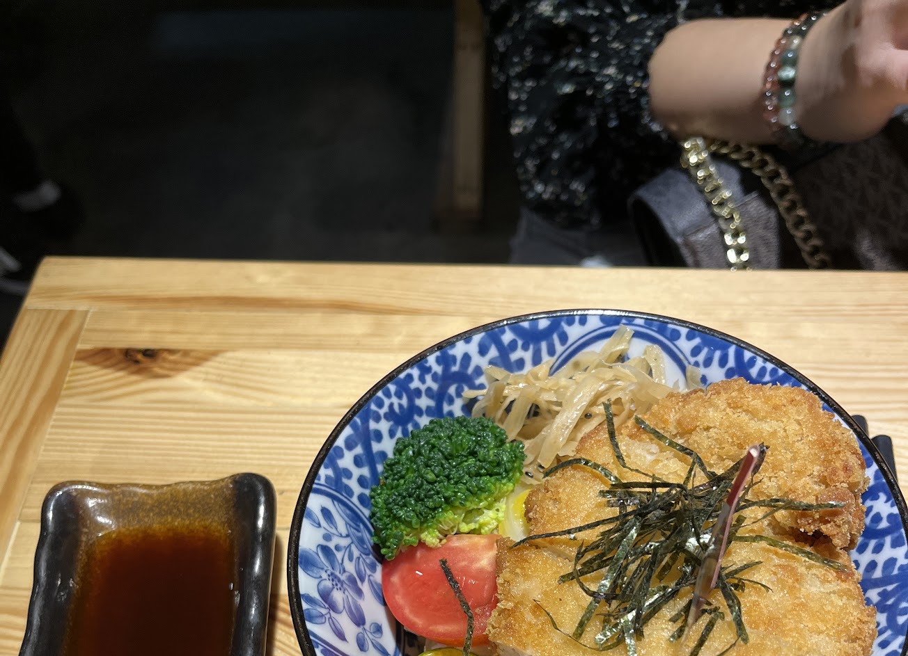 炸蝦丼飯,炸蝦好吃,醬汁與蛋黃混合的丼飯好吃,但怪的是有塔塔醬(還是沙拉)在上面,吃起來不搭且會把丼飯的味道搶走。
