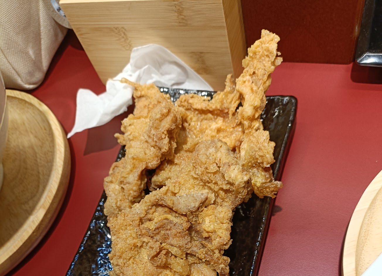 北海道炸雞「ザンギ(zangi)」北海道著名當地美食,將雞肉等的食材用醬油、生薑調味,再裹上麵粉或太白粉等當作麵衣後油炸料理 ,但這盤炸雞醃漬似乎不太入味,且油溫可能未達標準,炸出來雞皮有些軟(還是當店特色?)。