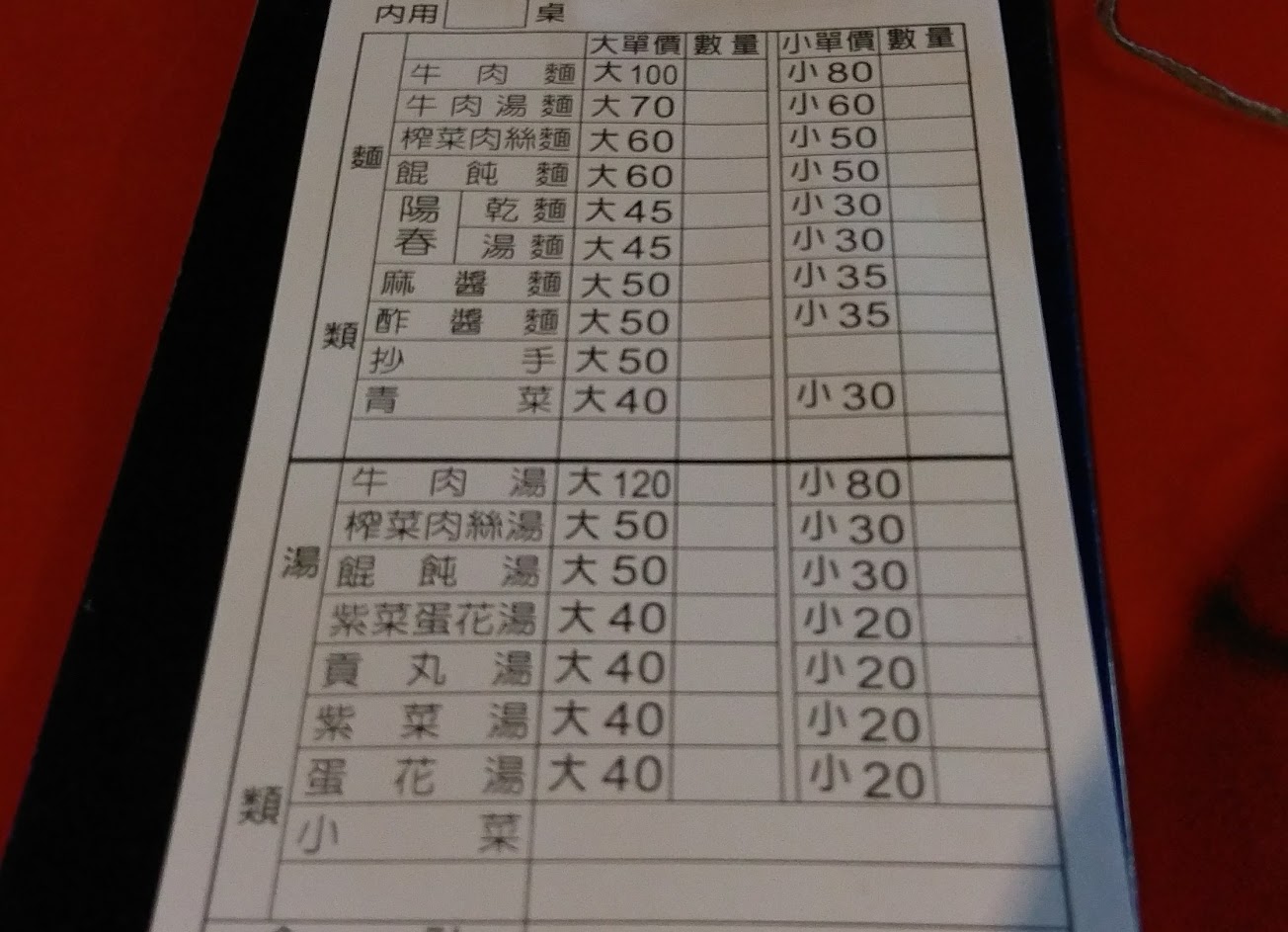 拿菜單先點麵食或湯類,然後交菜單再去夾魯菜類,夾完魯菜交給旁的阿桑(通常有2個)切,順便算多少錢。魯菜金額要記,然後去結帳,連同剛的菜單(報桌號)全部合計後,交錢給老闆,然後回桌位等上菜了,對了,魯菜需自己端回桌。以上~是內用的流程。