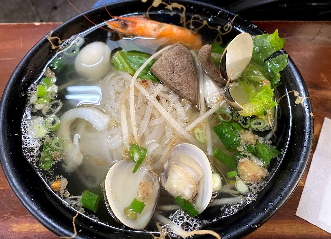 老闆是越南人…所以真的很道地…..點了豬肉河粉和炸春捲、還有燙青菜!很平價又吃的和滿足…生意很好位置要等附近都紅線停車不易!