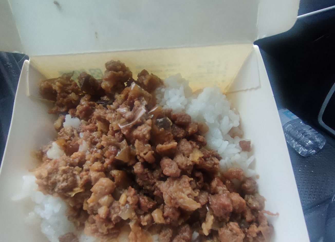 那當然就點下去了,毫不客氣毫無保留的飯量,裝到便當菜格裡都有飯,青菜量超大,有蘿蔔、花椰菜、高麗菜,還有豆輪豆腐。重點是淋上整大匙完全沒放回去意思的肉燥,而且都是瘦肉!配上點辣椒真是超美味,份量超足夠。小盒的肉燥飯也是滿到盒子闔不上喔!