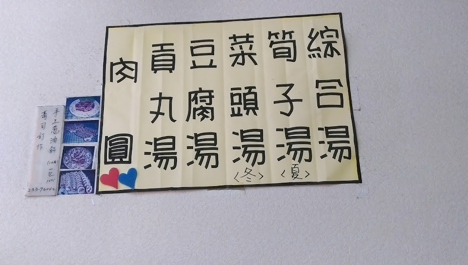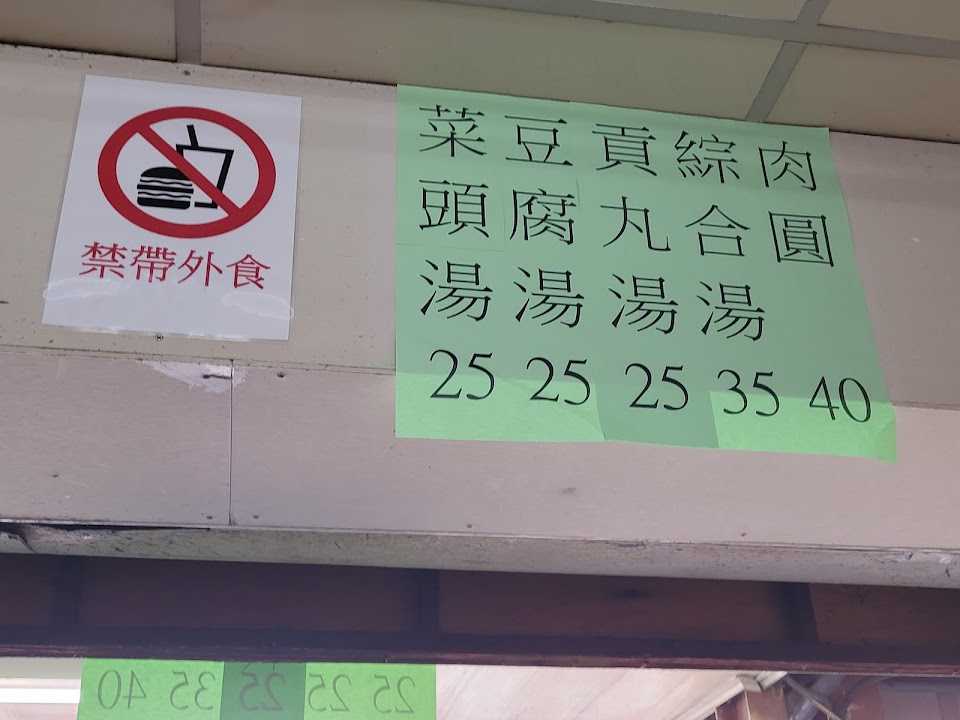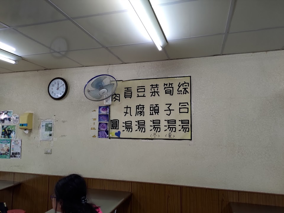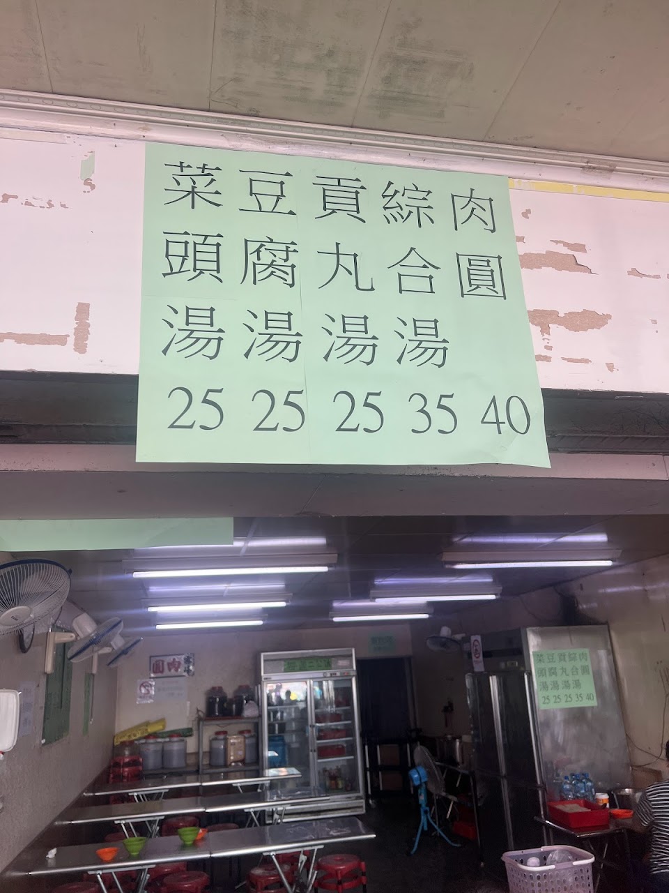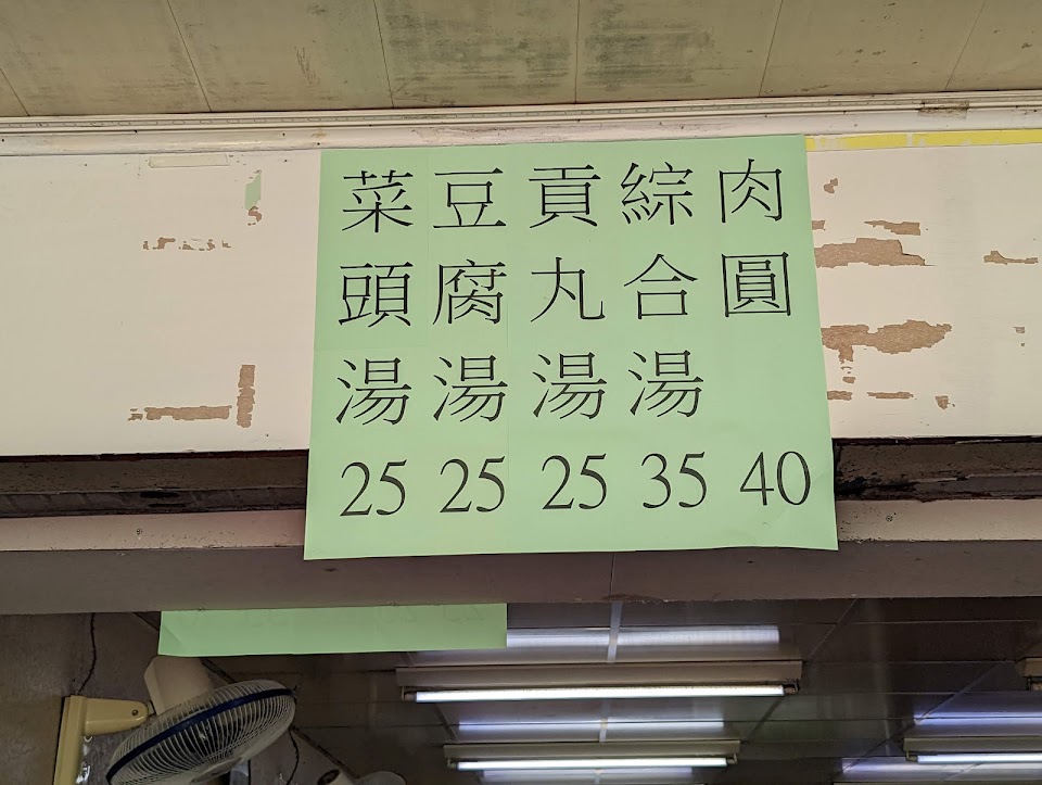 湯類有綜合湯、豆腐湯、貢丸湯、菜頭湯、筍子湯(夏季限定),湯料極多、撒上香菜芹菜末,清爽好喝,價錢也不貴。