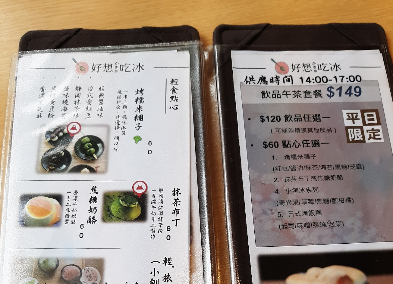 〔好想吃冰〕跟其他蔬食餐廳的不同,個人認為日式蔬食不同之處,除了日式小點– 烤麻糬 ( 糯米糰子 )、烤飯糰、抹茶布丁….當然還有各式冰品。