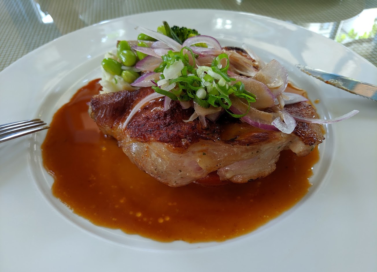沒有特別華麗的裝潢或擺盤,但是絕對可以好好享受的一餐,主菜的肉量足夠,熟度和味道也讓人滿意,從配菜(馬鈴薯泥)、沙拉內醃過的雞胸肉到甜點的烤布丁都不馬虎的好吃