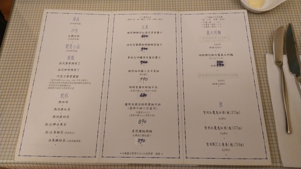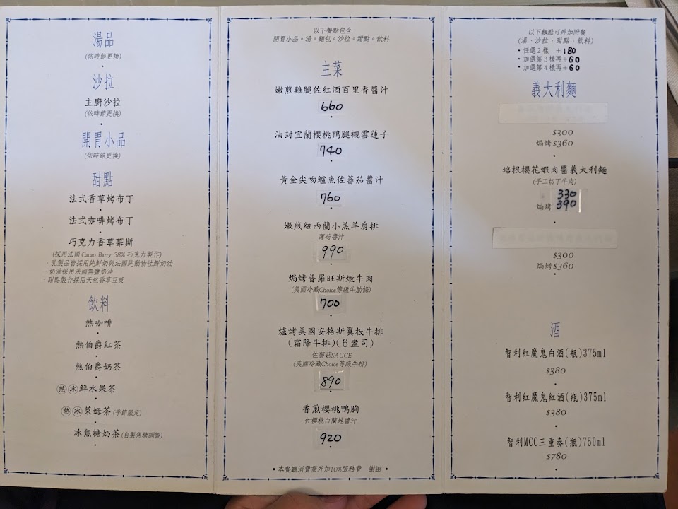 餐點普通覺得CP值不高 菜色不豐富很普通 840元的鴨胸也沒有留言寫得好,切得很薄是因為很硬 而且還是吃到咬不斷吐掉了 覺得還可以的大概只有牛排 但這個價位吃王品或陶板屋即可