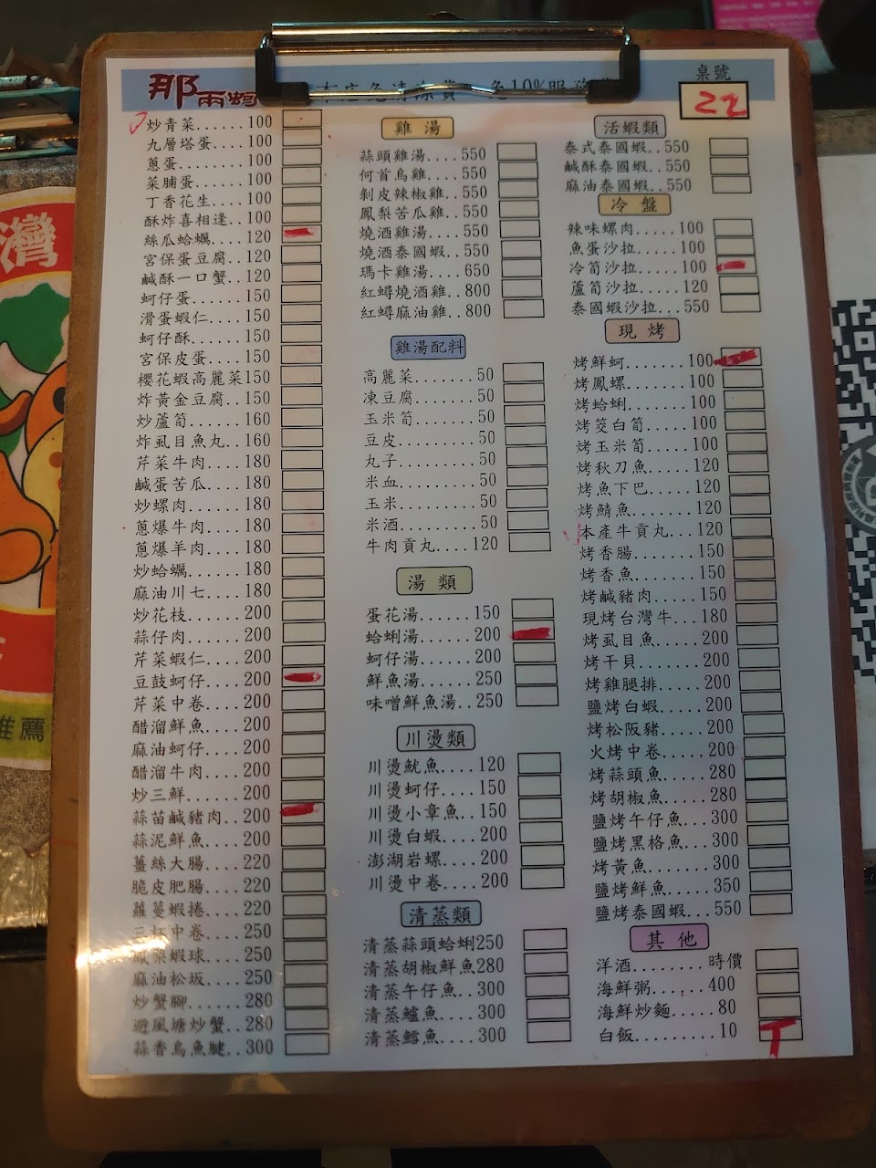 我覺得餐點不是很ok,就我點的餐點全部評論 1.烤蚵:沒有到很新鮮,如其他評論一樣很小顆,因本人不敢吃太生,店員有告知如果再烤會變小,但這個蚵真的本來就不大了 2.玉米筍:新鮮好吃 3.炒菠菜:好吃,但口味偏重鹹 4.鳳梨苦瓜雞湯:整個湯頭除了罐頭或醃漬鳳梨的怪味,喝不到雞湯喝苦瓜的味道,雞肉是柴的 5.川燙中卷:還算新鮮 6.清蒸紅蟳:這道完全是惡夢,一靠近要吃就散發惡臭,完全不敢吃請店員拿回去給師傅聞,也告知不需要再做一份給我們,我們不敢吃,這道最後店家沒算錢,並說是冰箱味(?,因為跟肉冰在一起才會有這樣的味道⋯⋯ 7.鹽烤黑格魚:新鮮,只是有一面沒烤熟 8.烤鳳螺:味道太腥,不敢吃 服務部分:店員身上煙味很重、店長服務不錯 最後店長還送了12顆烤蚵給我們,我們沒收,感謝店家好意,但真的不想吃了⋯ 餐點類型 晚餐