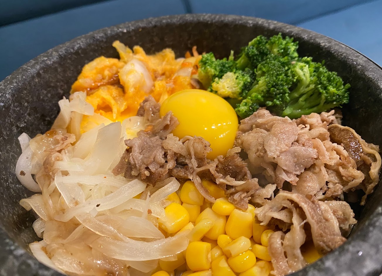 豆芽、玉米、花椰菜、 洋蔥和紅蘿蔔,在石鍋中攪拌,米飯形成一層鍋巴,香氣十足口感好吃。