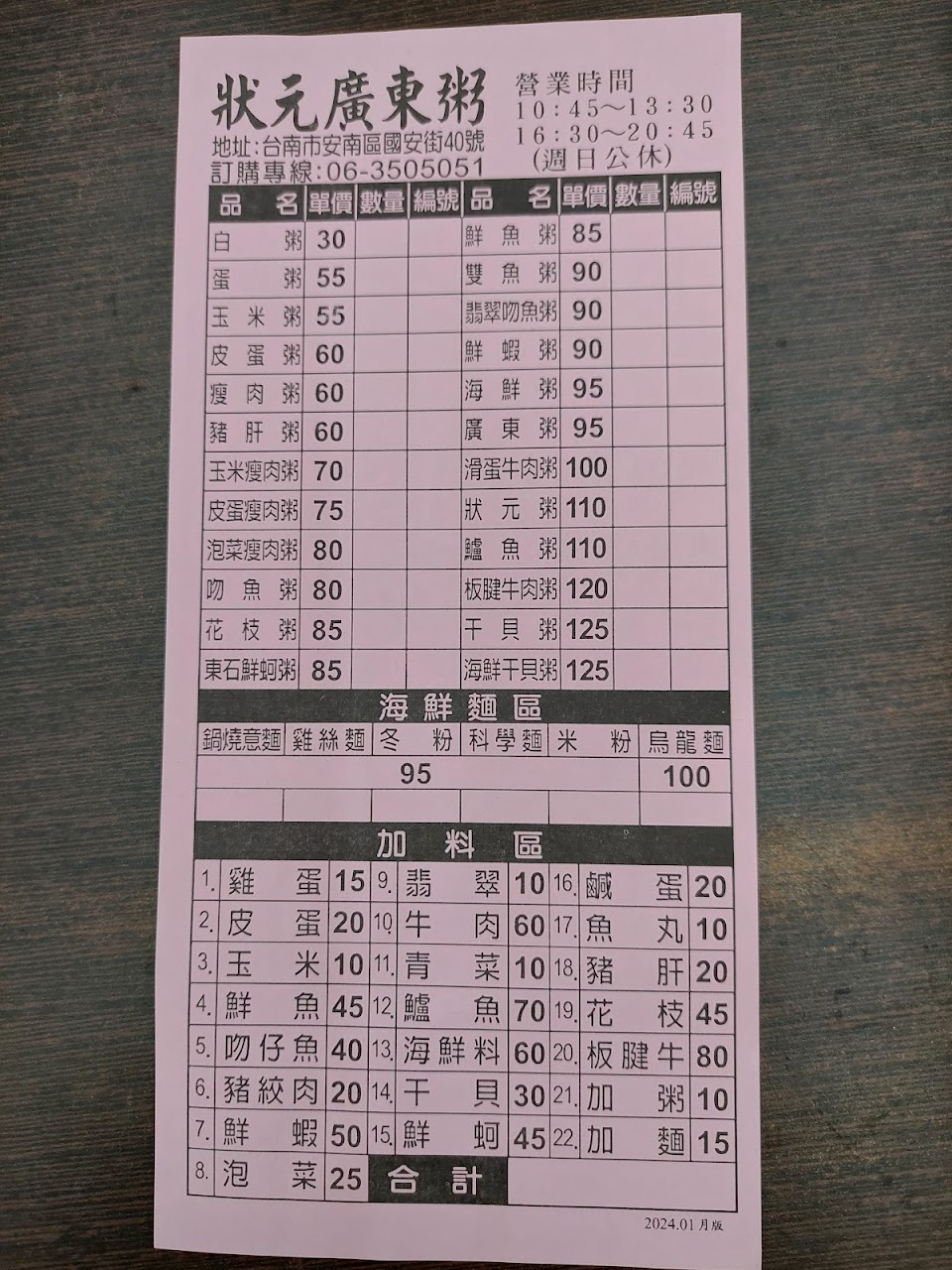2024最新在地推薦餐廳的菜單_狀元廣東粥-台南國安街 蛋粥 豬肝粥 皮蛋瘦肉粥 玉米瘦肉粥 泡菜瘦肉粥 翡翠吻魚粥 花枝粥 鮮魚粥 廣東粥 海鮮粥 鱸魚粥 滑蛋牛肉粥 干貝粥 海鮮鍋燒意麵 海鮮烏龍麵的菜單、圖片