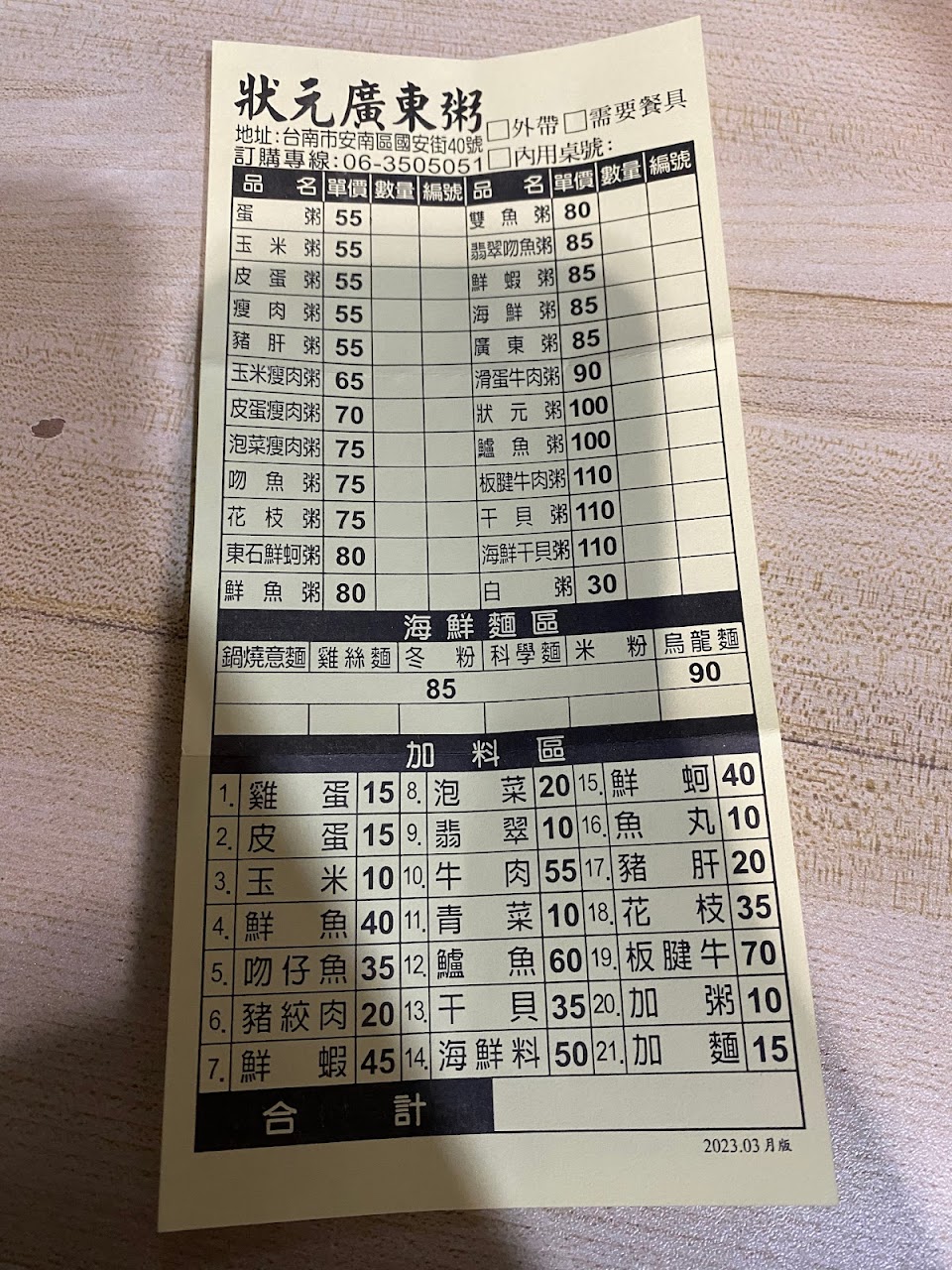 狀元廣東粥-台南國安街 蛋粥 豬肝粥 皮蛋瘦肉粥 玉米瘦肉粥 泡菜瘦肉粥 翡翠吻魚粥 花枝粥 鮮魚粥 廣東粥 海鮮粥 鱸魚粥 滑蛋牛肉粥 干貝粥 海鮮鍋燒意麵 海鮮烏龍麵