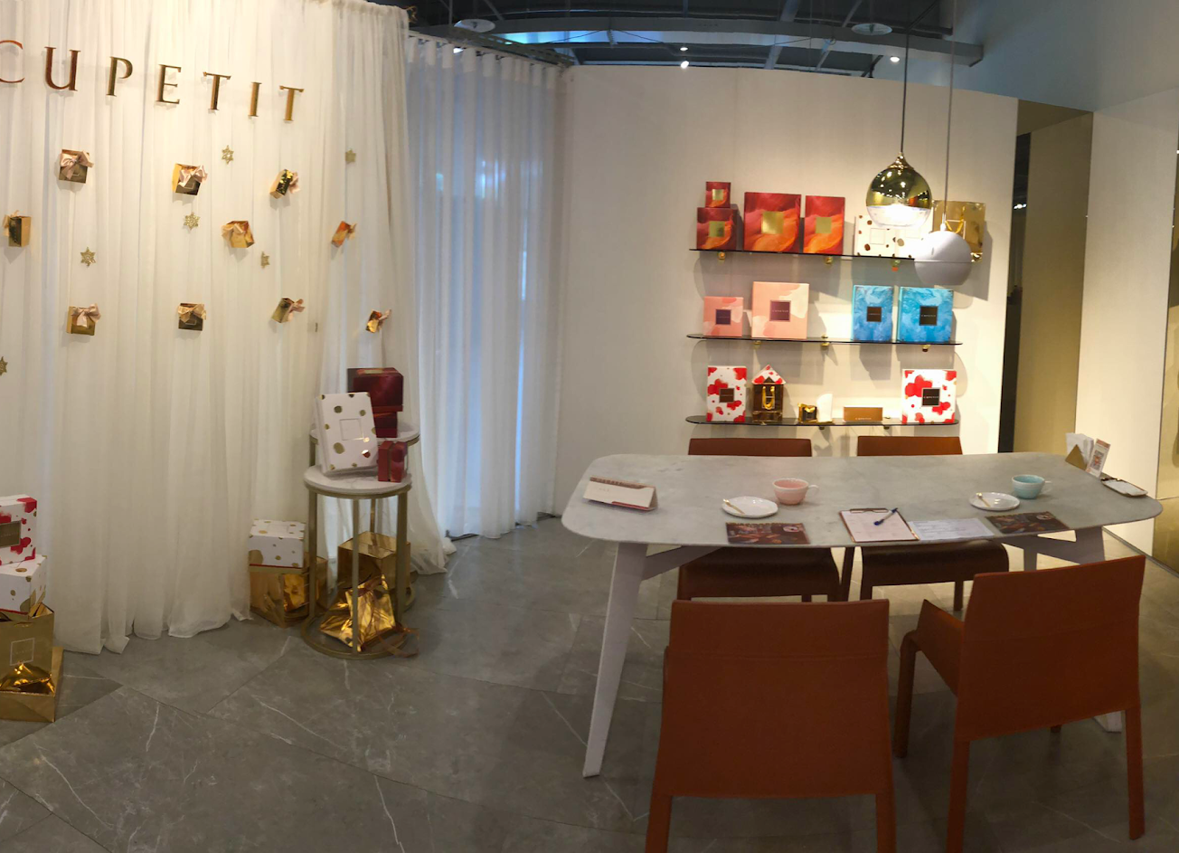 從試吃空間與禮盒包裝,都能看見【CUPETIT 卡柏蒂】亮橘與金黃的主色調 很明顯感受得到品牌突出的豪華大氣路線