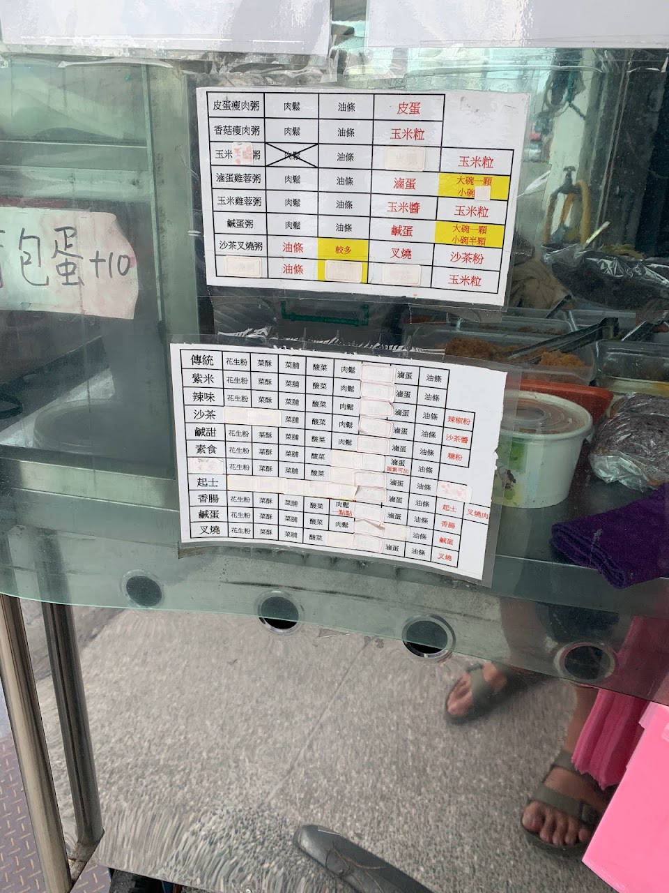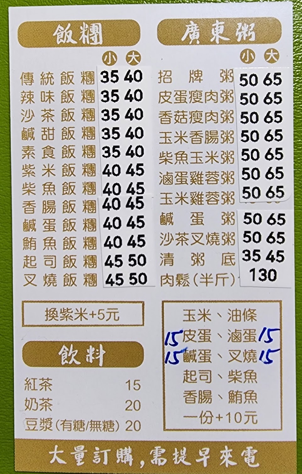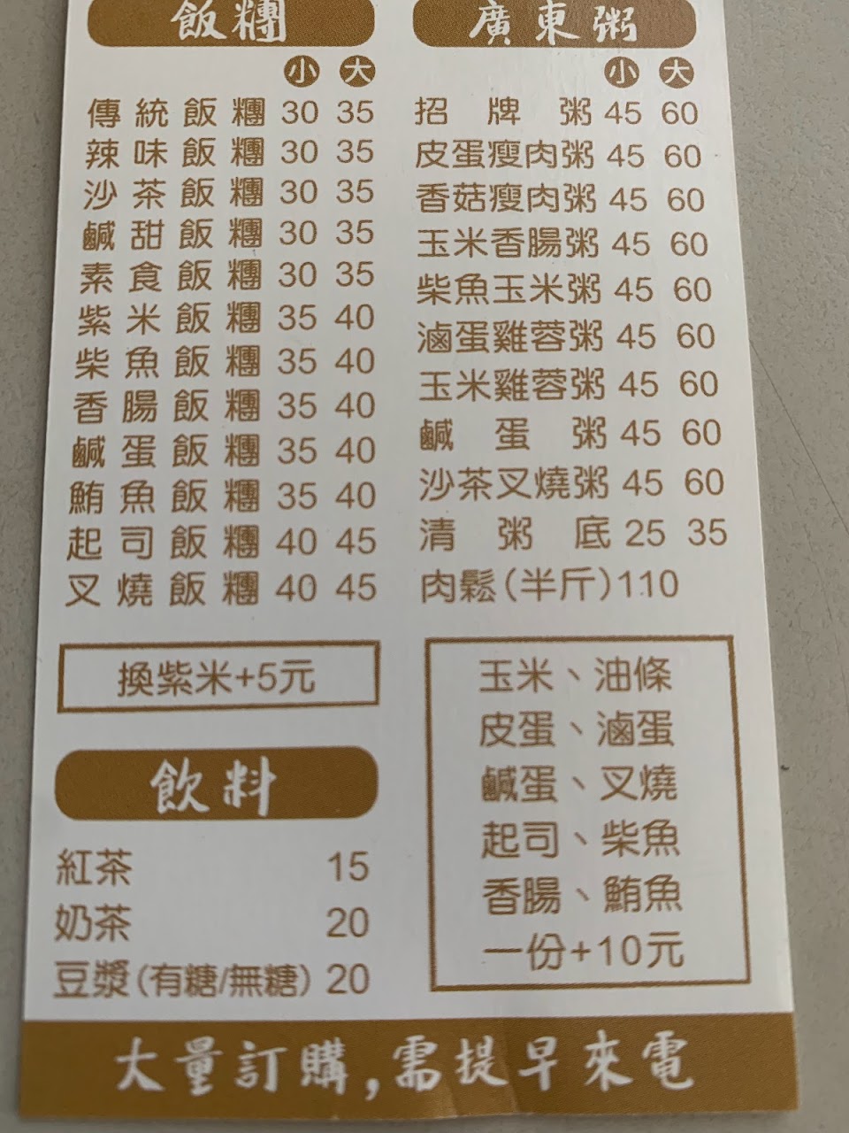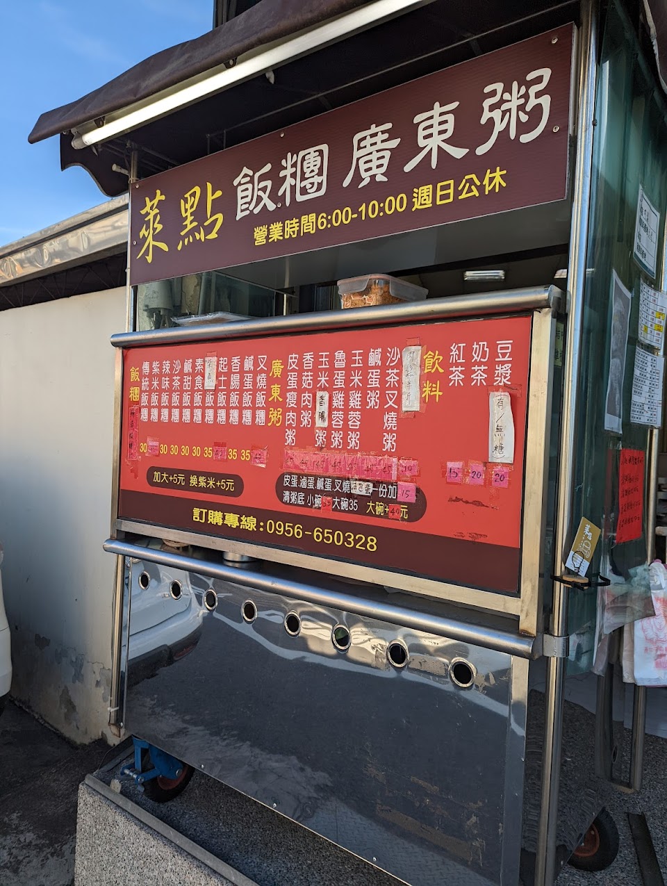 超值的廣東粥及台式飯糰的早餐店,飯糰選擇多樣,老闆將各種飯糰的用料差異列表公開,讓人一目了然,方便客戶選擇,也可依個人喜好微幅調整飯糰用料項目,可先Line點餐後再過去取餐,回應迅速,餐點製作完成後,老闆會先將餐點放在保麗龍盒內保溫,非常貼心。