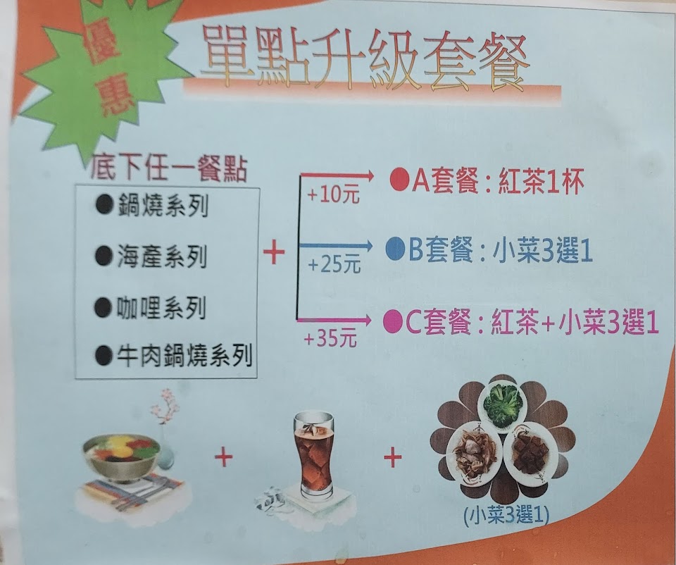 闆娘人很好,當天去用餐時其實離店家休息時間只剩20幾分鐘,可是闆娘還願意讓我們內用,而且現在打卡還有送紅茶。鍋燒系列內容物有隻不算小的蝦,有貢丸,有肉,有蛋,有菜,有火鍋料,湯頭也不錯。咖哩系列就比較大衆化
