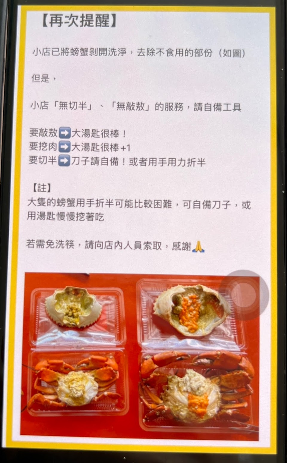 店家也太貼心了,幫我們做好每一份介紹,還很有耐心說明,所以不用怕花了錢卻不知道大約的數量!最重要的是都幫我們挑選好了,今天ㄧ收到螃蟹就立馬開來吃,根本忘了要拍照了,裡頭真的滿滿的膏跟卵!真的感受的出店家的用心~