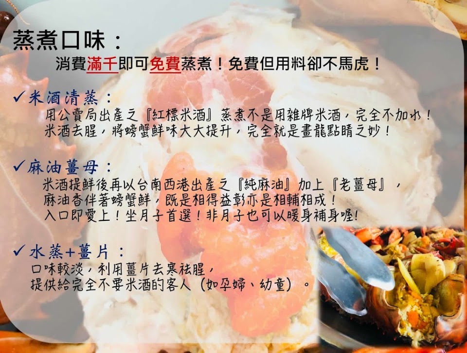 螃蟹很新鮮,清潔的很乾淨,小朋友也能接受的口味,外帶回家,全家吃的開心又暢快,非常推薦!另外,小編細心專業,詳細了解客人需求,提供適當建議?