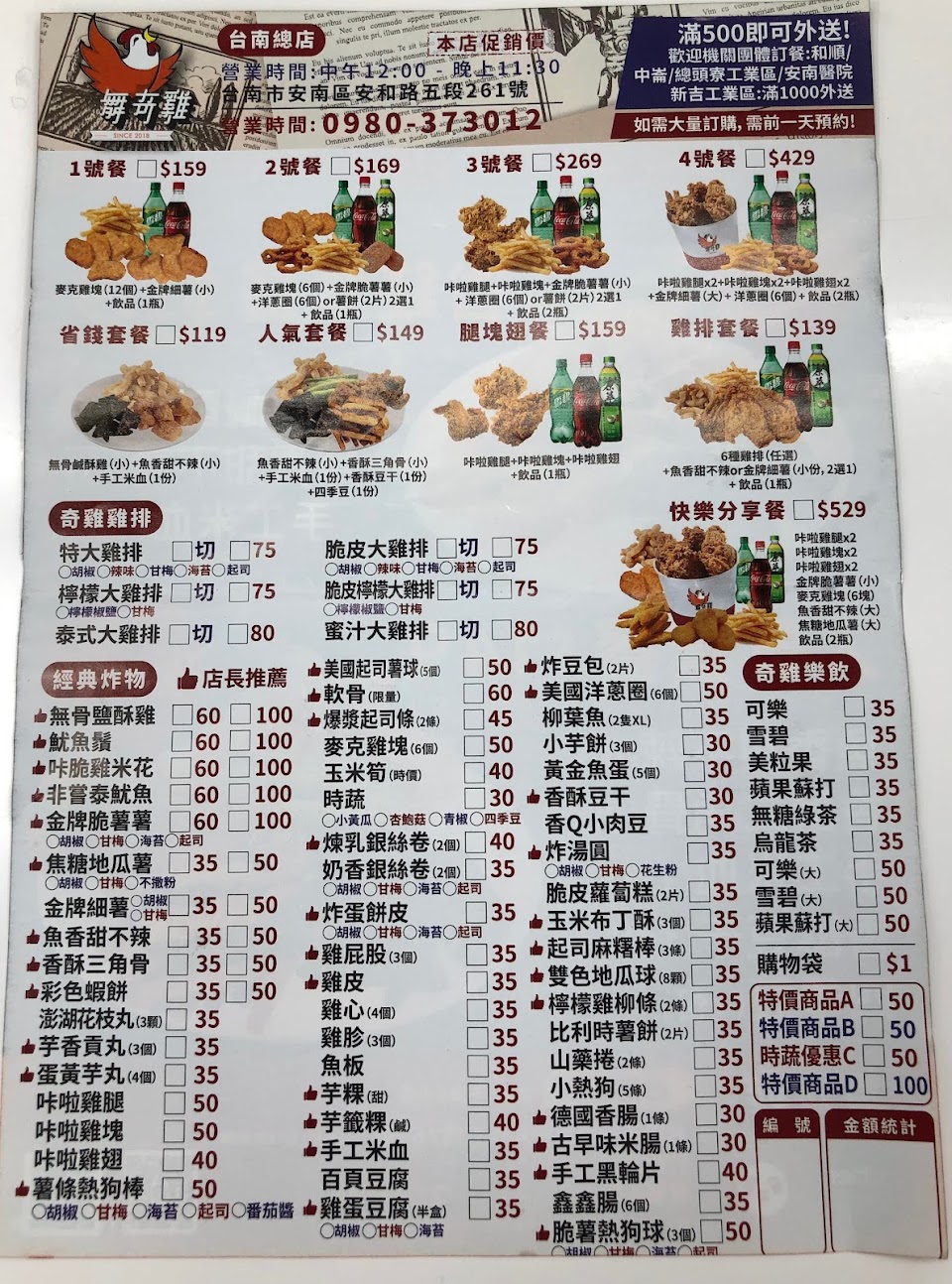 2024最新在地推薦餐廳的菜單_舞奇雞台南總店 點心炸雞雞排專賣的菜單、圖片