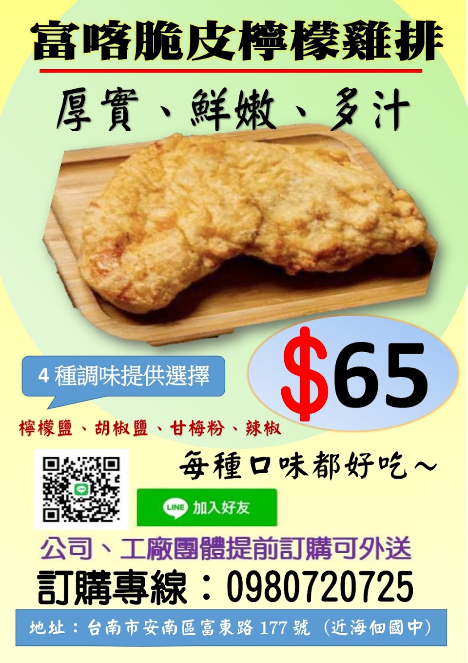 清爽的檸檬雞排,多汁,美味,不會油膩,墨魚甜不辣QQ的口感,下午茶,不知道要吃啥點心的好選擇!可以先電話訂購省時間