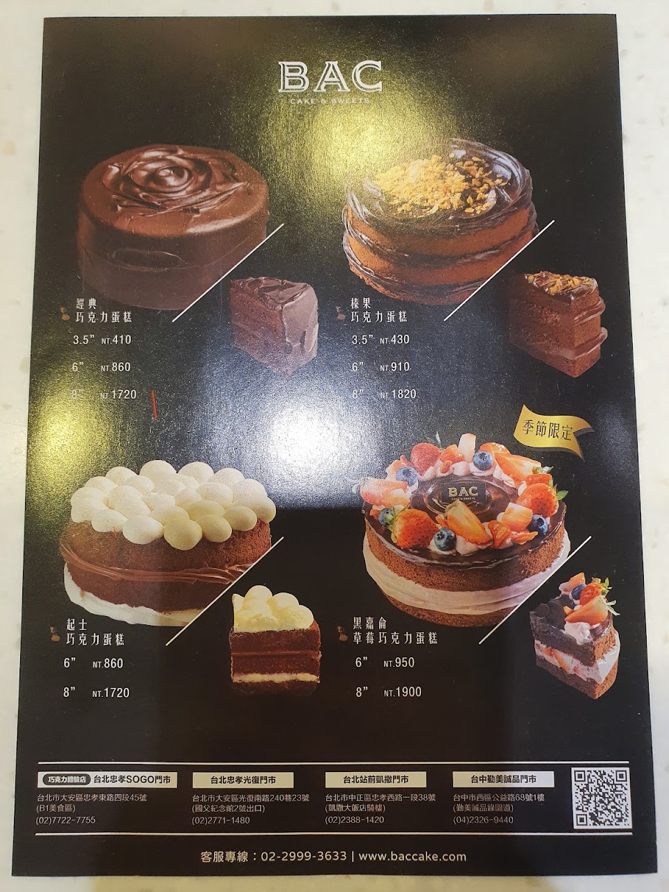 6寸的黑嘉侖草莓巧克力蛋糕價格漲到950,口感和之前差滿多的。本來沒有想買的,只因為男友記得三年前買的時候我和家人讚不絕口,這次再訂一次。覺得有點可惜,現在很多間的蛋糕都不輸BAC…不附保冰袋或提袋,大概只有開車才能買