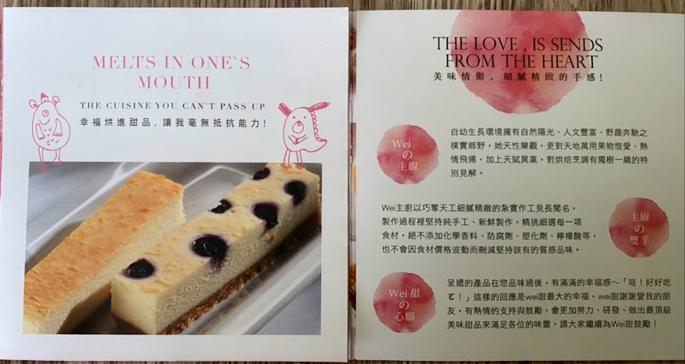 這店名~源自於一個女人對美食的夢想,卻遇到了男友小熊先生後,才激發她內心對甜點的熱情與全心投入,取名為WEI甜,因為心裡有一點甜,而在微甜不只充滿的愛也洋溢著滿滿的幸福!