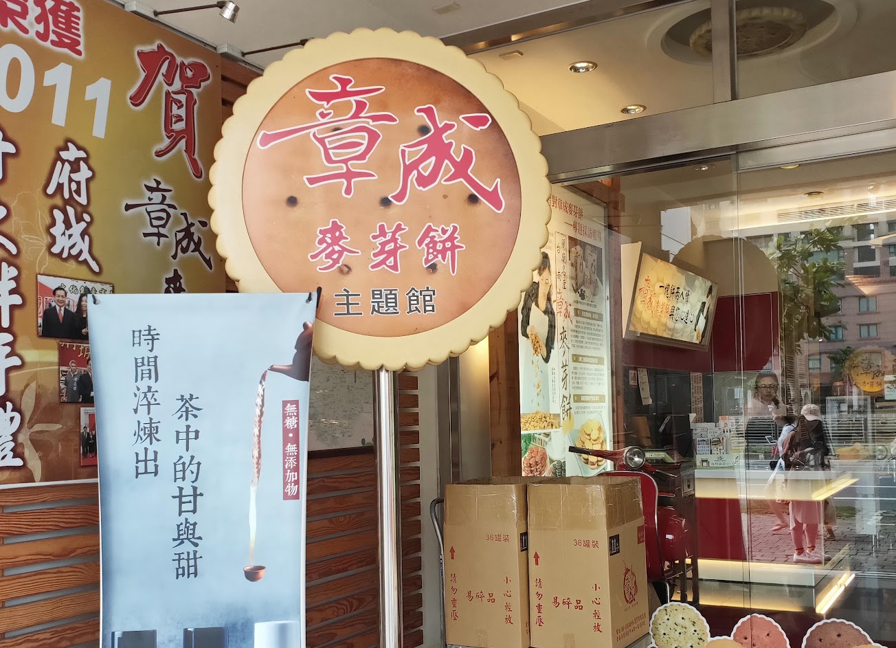 『章成麥芽餅』成立於2000年,原承襲父親製作麥芽糖的技術,以生產一口麥芽餅,強調麥芽糖Q軟、不黏牙為最大特色與訴求。