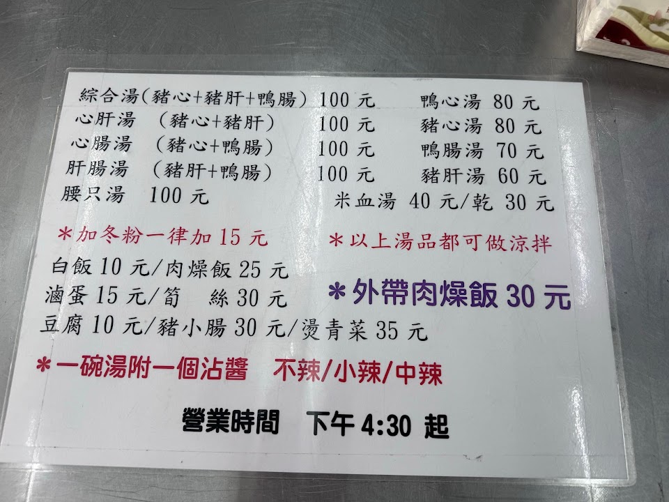 心肝湯湯頭好喝,價位適中,上餐速度快,但不好停車,肉臊飯有點過鹹。