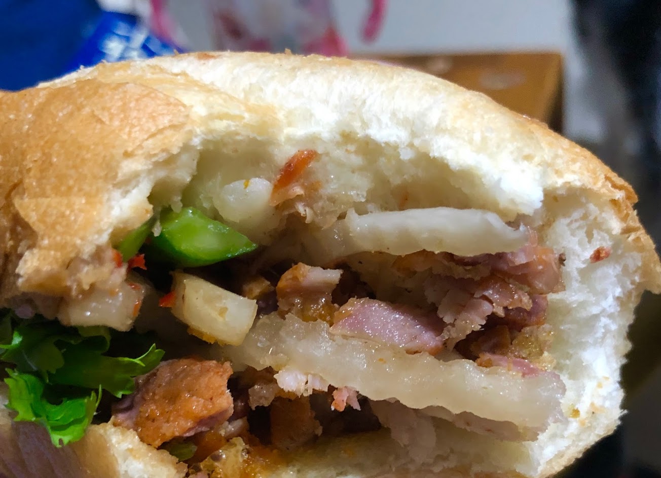 快吃完才記得拍照。麵包烤的外酥裡嫩,內餡的脆皮烤豬肉加上清爽的小黃瓜、蘿蔔、現剪的香菜,一些辣椒醬,真的超好吃。