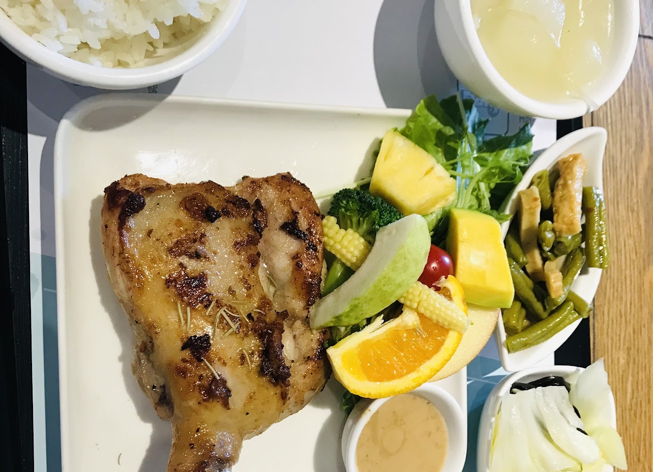 沙拉醬用胡麻醬整體覺得很怪異,沾水果吃有點不太搭,飯口感糊的覺得不ok,甜點的綠茶凍吃起來很像廁所芳香劑的味道…..白花椰菜加上花生粉也很怪,後來有沾到美乃滋吃了才感覺好一點,建議如果是這樣的話美乃滋要放平均一點,紅茶也不好喝,主餐雞腿排就還可以