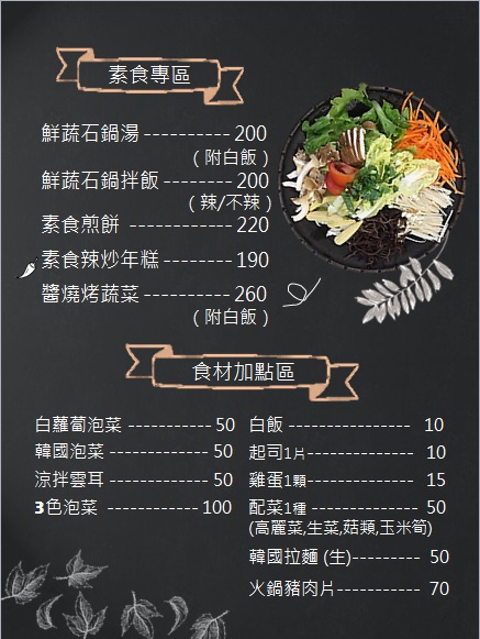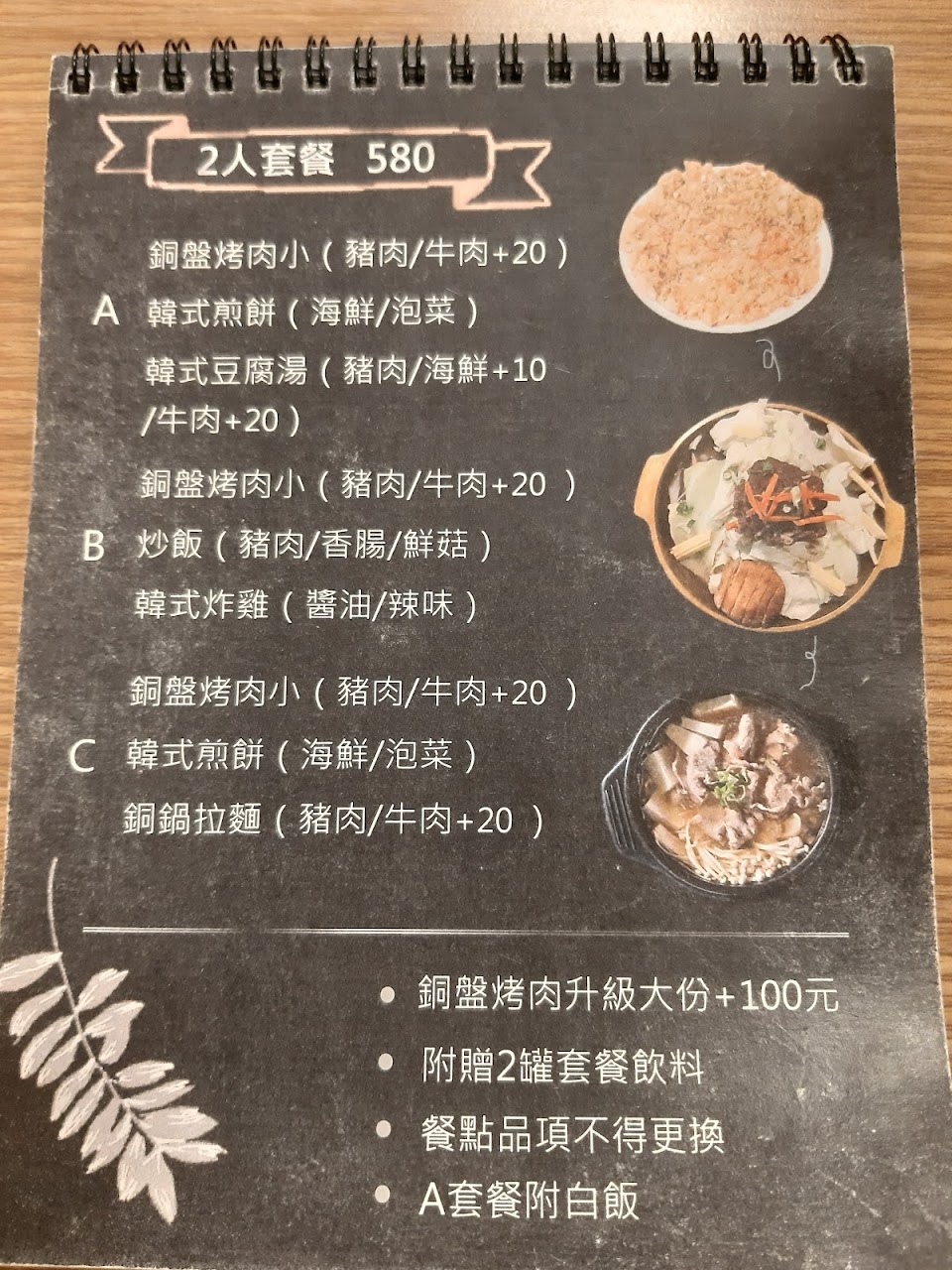 有銅盤烤肉(加100元可以加大)、韓式炸雞和韓式煎餅(二擇一)、豆腐鍋和炸物拼盤。