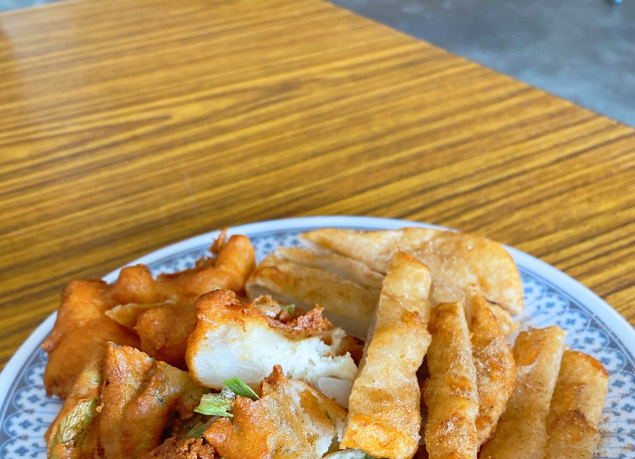 剛剛老闆娘說,她們裹的是黃豆跟米漿去調和,沒有放麵粉,炸的時候比較不會含油