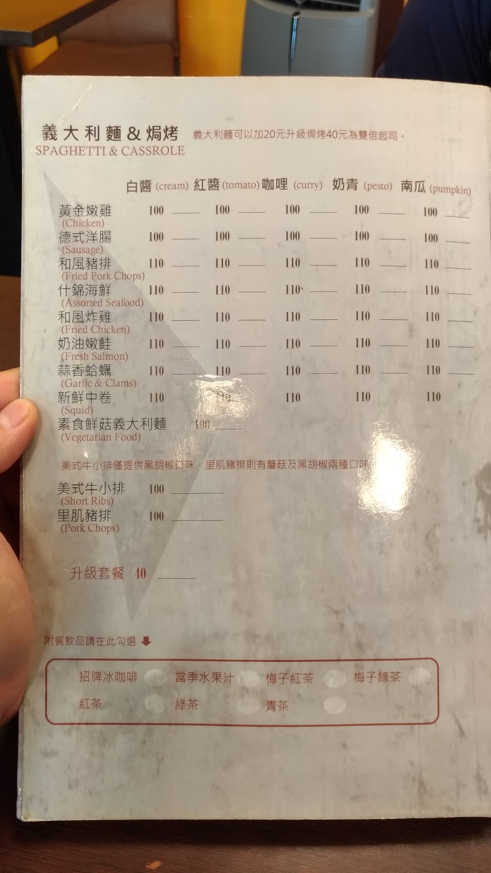 焗烤義大利麵、飯 對國小生來說都可以吃的完,炸雞腿,手打豬排飯很好吃,很平價又親民的小餐廳