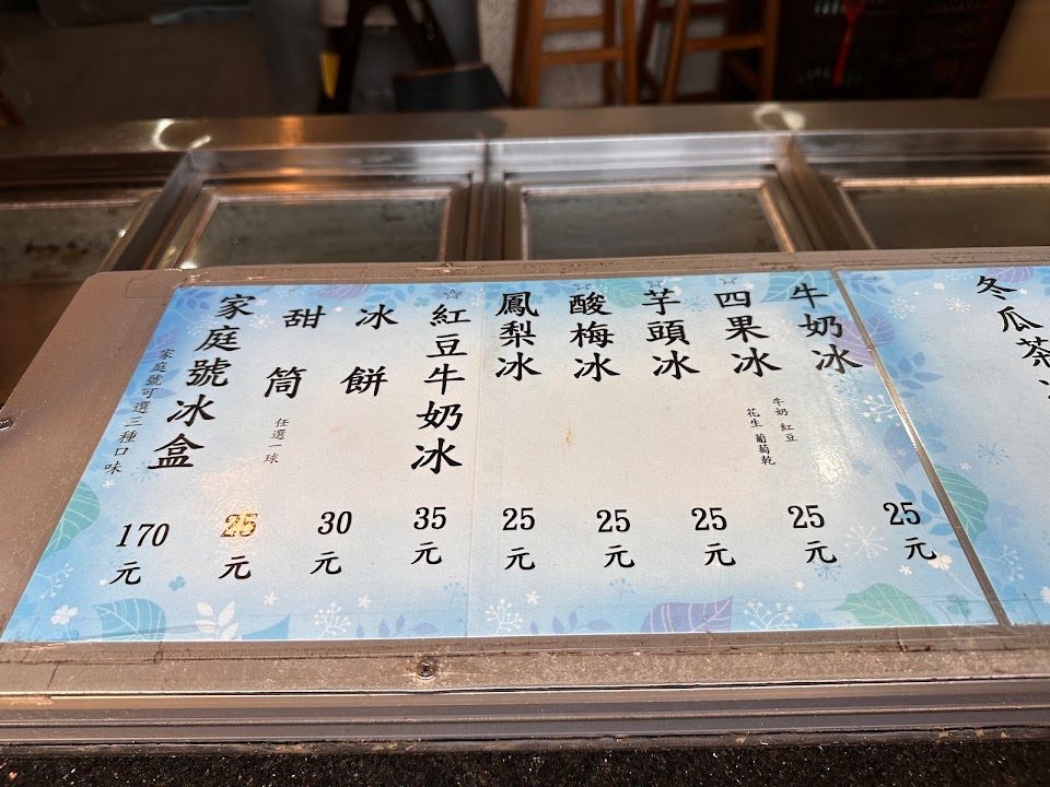 隱藏在市場裡的小巷弄中,看起來是民宅改建的冰品店,當天只有提供3個種類,冰品都是現點之後直接從冰桶裡面直接挖取,所以不會像部份冰品店事先裝好在杯子再凍在冰箱的那麼硬;最喜歡酸梅冰和鳳梨冰,芋頭冰也是不錯,但因為先吃了酸梅和鳳梨,相比之下芋頭的口味比較沒有那麼突出,整體感覺還蠻喜歡的。