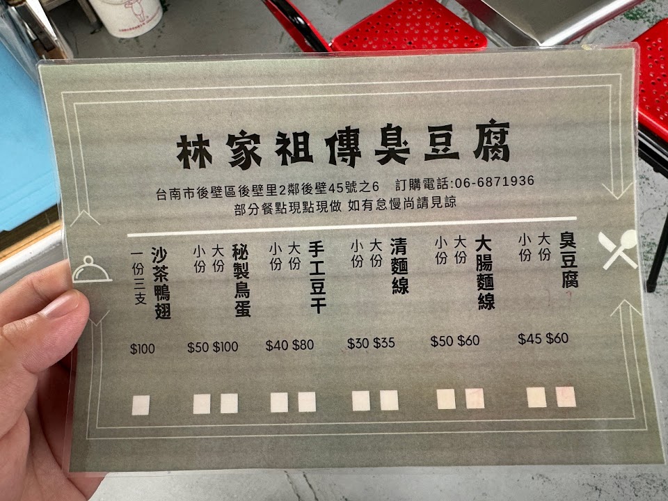 2024最新在地推薦餐廳的菜單_【林家祖傳臭豆腐】客製化酥脆臭豆腐、香Q大腸蚵仔麵線、【手工秘製】滷豆干、鳥蛋【隱藏版菜單】沙茶鴨頭、沙茶鴨脖子、沙茶鴨翅的菜單、圖片