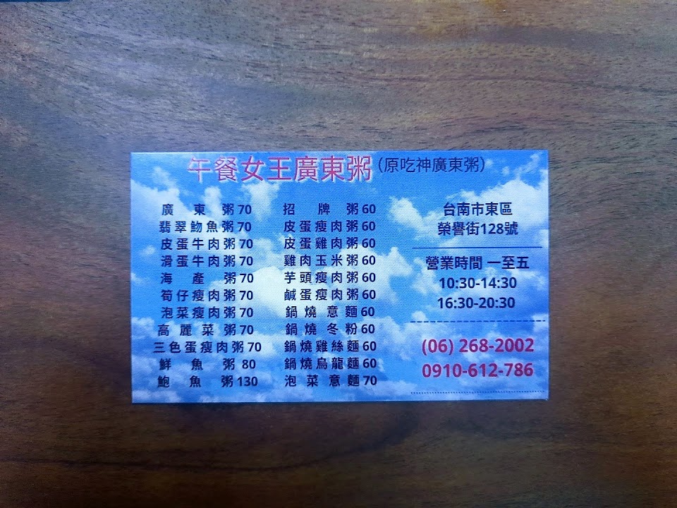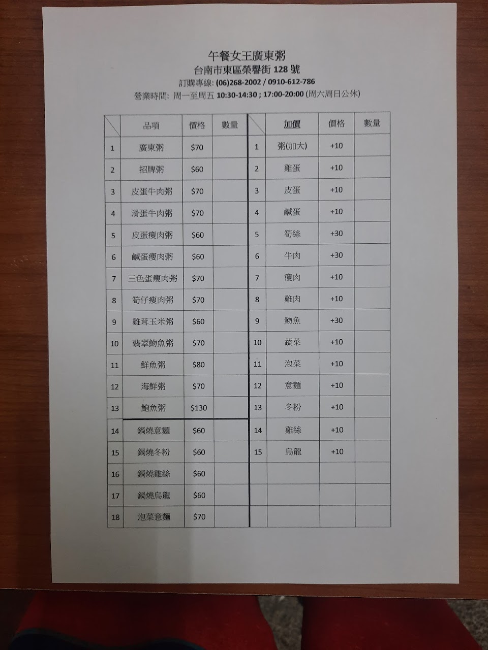2024最新在地推薦餐廳的菜單_午餐女王廣東粥(榮譽店)的菜單、圖片