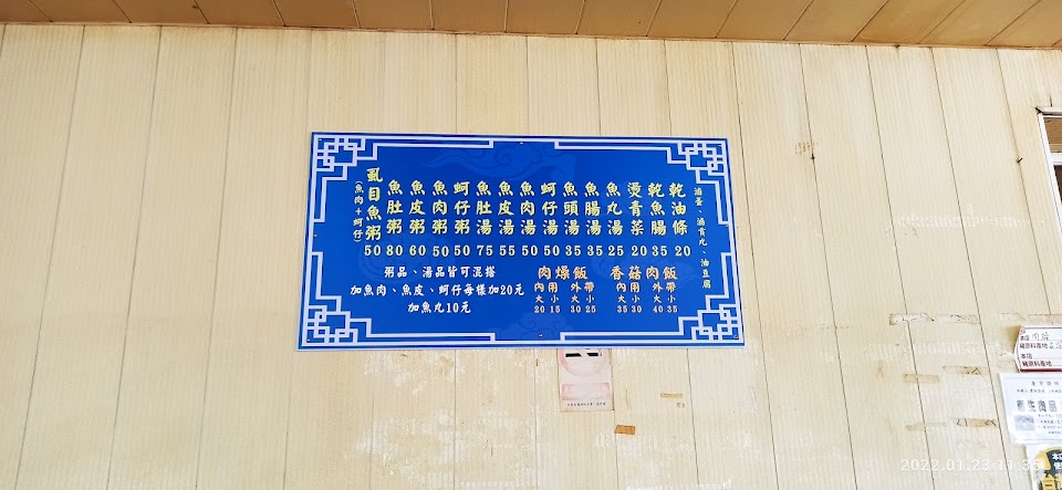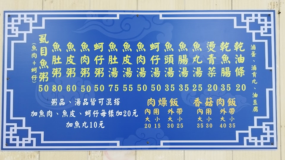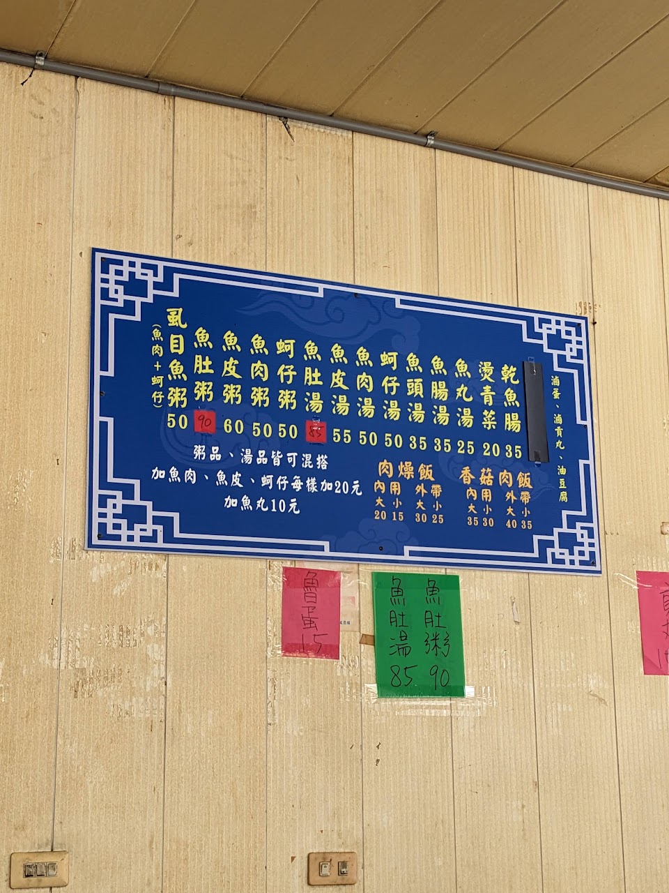 店內賣煮的,沒有煎的,鹹粥、虱目魚肚、魚皮、魚頭、魚丸、魚腸料理,另外還有肉燥飯及香菇肉飯,魚腸相當熱門,11點後可能就賣完了。