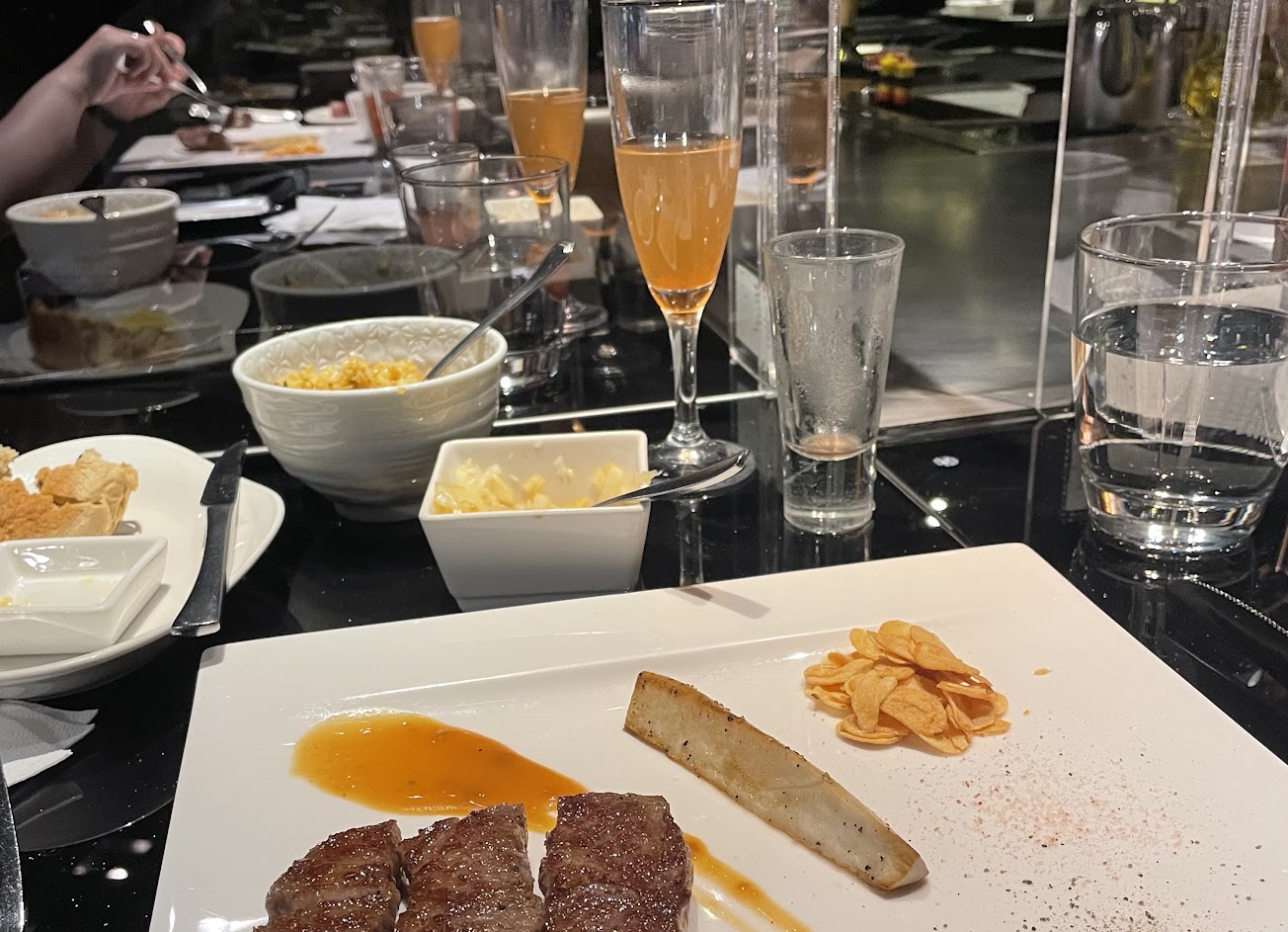 餐點服務都是高水準的鐵板燒店,交通方便,用餐氣氛佳,適合特別節日招待的餐廳選擇。這次遇到情人節期間有推出專屬菜單,開胃菜很清爽好入口,魚子醬鵝肝蒸蛋濃淡相宜,麵包及洋蔥都相當夠味紮實,牛肝菌濃湯燙口綿密,每一口都充滿牛肝菌及蕈菇的香氣,燻鮭魚沙拉佐蜂蜜芥末超搭不會太衝突,小卷明太子炒飯粒粒分明挺有海味的,海陸套餐的花尾蝦及干貝熟度適中,鮮甜味十足,咖喱海大蝦層次豐富,蝦肉甜與蝦頭鮮,搭上一顆蛋與節瓜,口味多層次,加價的肋眼牛排五分熟熟度剛好,肉質軟嫩多汁,取下的牛筋做到全熟處理更有另一番風味,甜點飲料也是有一定水準呈現。整體消費質感很高,偶爾有搭配紅白酒活動可以多加關注店家資訊。