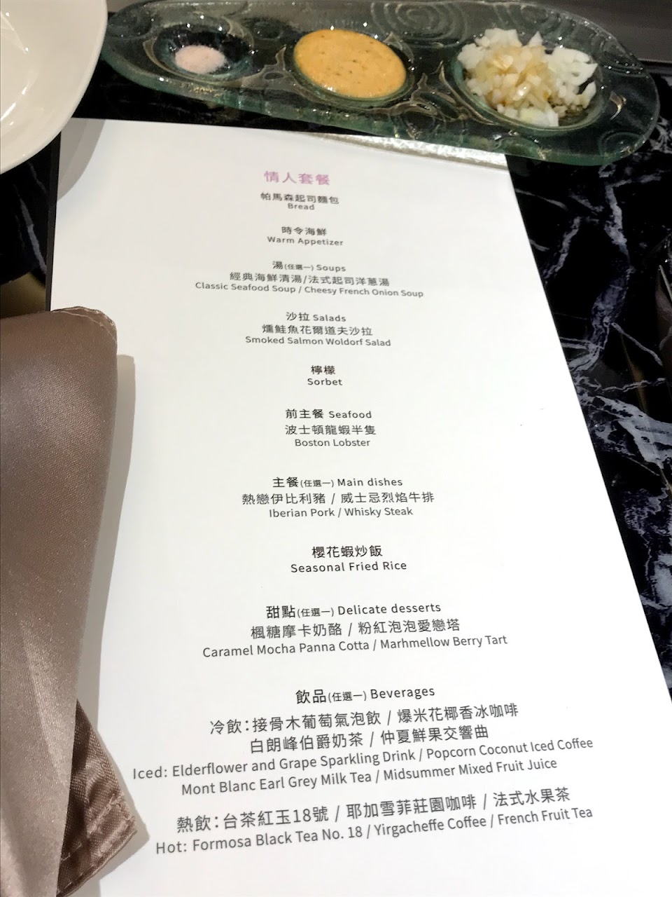 • 蘋果沙瓦:不確定名稱,是上桌時就會供應的飲料,很清爽,有微微的酒精味道,可以續杯 • 前菜:松露蒸蛋非常滑嫩,松露香氣很濃郁;麵包小點非常好吃,調味很棒也很精緻 • 麵包:帕瑪森麵包搭配魚卵沾醬,我覺得那個沾醬非常完美,微微的嗆辣味搭配魚卵,要不是怕太撐我應該會吃2個麵包 • 法式洋蔥湯:有一片搭配的洋蔥餅乾,沾著吃挺不錯,湯是好喝的,很濃郁,不過喝久會覺得有點單調,稍微油膩 • 煙燻鮭魚凱撒沙拉:擺盤很繽紛美麗,生菜搭配一些乳酪和燻鮭魚,沾著凱撒醬也很好吃 • 檸檬Sorbet:去油解膩很清爽 • 白蘭地鴨胸:主廚會特別說明使用的酒類,烹調時有火焰,同時具有視覺效果,鴨胸肉質軟嫩表皮酥脆,搭配特製醬料不會過鹹 • 季節炒飯:這次是櫻花蝦&魚卵的炒飯,調味很棒,炒飯粒粒分明,很喜歡這道炒飯 • 紅玉布蕾:很精緻的甜點,應該是紅茶布丁,但是其實吃不太出紅茶味,感覺是焦糖布蕾,整體偏甜 • 黑岩伯爵奶茶(冰):我覺得唯一不太滿意的就是奶茶,上面的鮮奶油太多了,很油膩,雖然具有視覺效果,但喝起來就只有油膩感,我認為剛上桌時的蘋果沙瓦比較耐喝