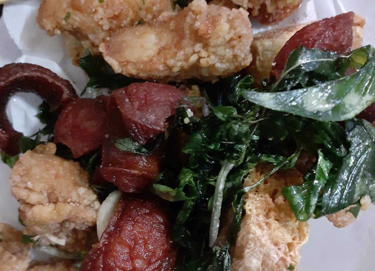 雞肉是稍微大塊帶骨的,甜不辣是厚片的有咬勁但微甜,馬鈴薯塊炸的裡面鬆軟,起鍋前加入九層塔蒜片爆香,脫油器脫油,再用一層廚房紙巾吸油