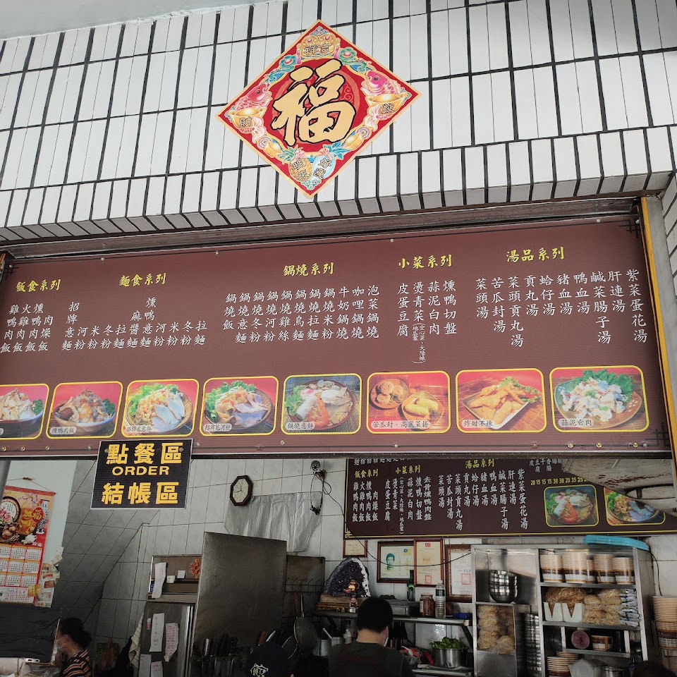 鴨肉飯、鍋燒專賣店,有關東煮的湯可以免費取用。店家門口有位子可以停車,此外店內餐具點餐等等都是採自助式的,但是店員會幫忙送餐。店家的營業時間開的比較晚,若是比較晚下課,這裡是吃飯的好選擇。