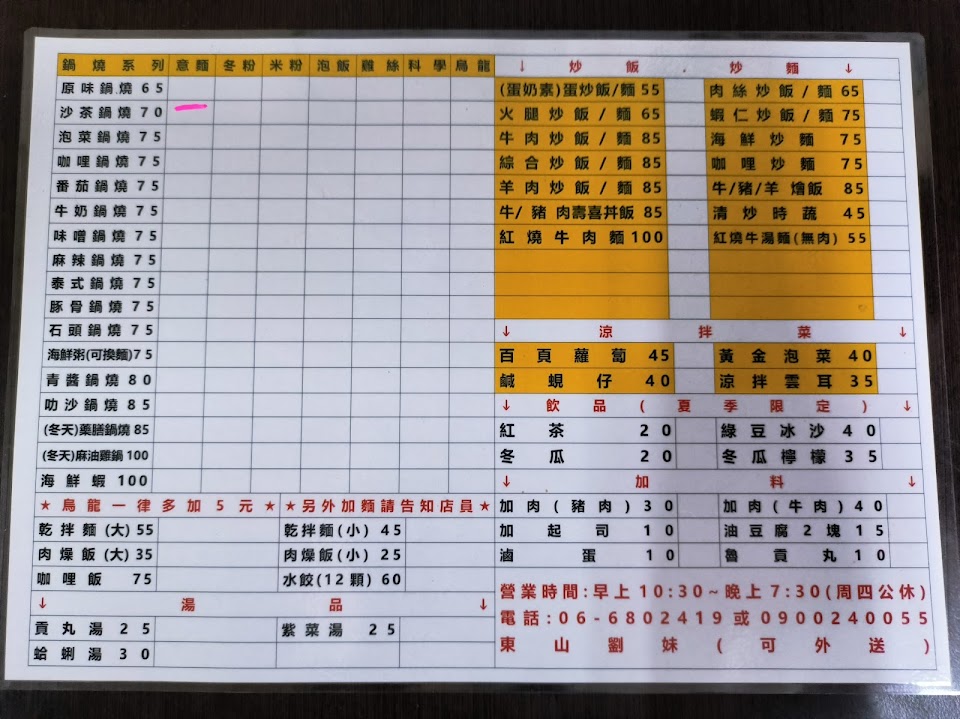 2024最新在地推薦餐廳的菜單_東山店-劉妹鍋燒意麵的菜單、圖片
