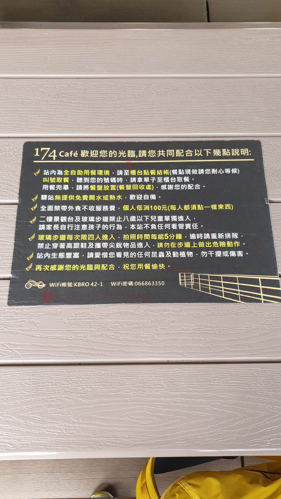 很棒的地方,有天空步道可以拍照?,餐點也好吃,點套餐的話還可以用6折價加購飲料?來喝,低消$100(每個人都要點一份餐),用餐完畢要自行收拾(採自助式的喔),天空步道的拍攝時間也只能拍5分鐘喔!(讓每位客人都有時間拍攝,這個限制我覺得ok)唯一的小缺點就是戶外蒼蠅會陪你吃飯… 如果放幾個黏蒼蠅的可能會好一些(但可能會不好看就是?)