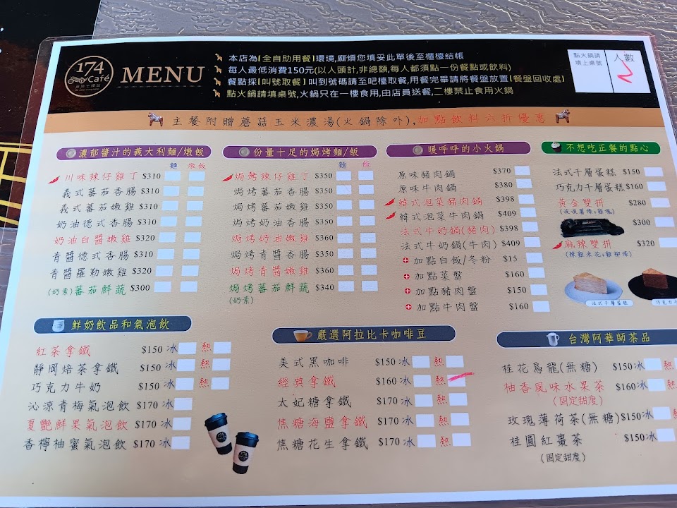 來這請先選位子,櫃台告知人數拿取菜單