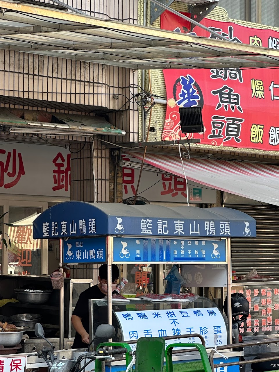 兩攤藍記相鄰,一攤賣鴨頭與翅膀之類,另一個賣豆干、 鴨血糕、 甜不拉等。應該是同一家,排隊隊伍長短不同。
