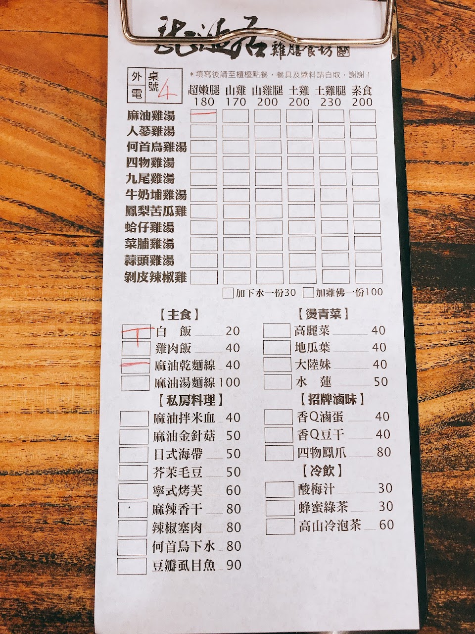 點餐方式先選腿在選雞湯口味,最後選了土雞腿$255,蒜頭雞湯、和乾麵線$50。