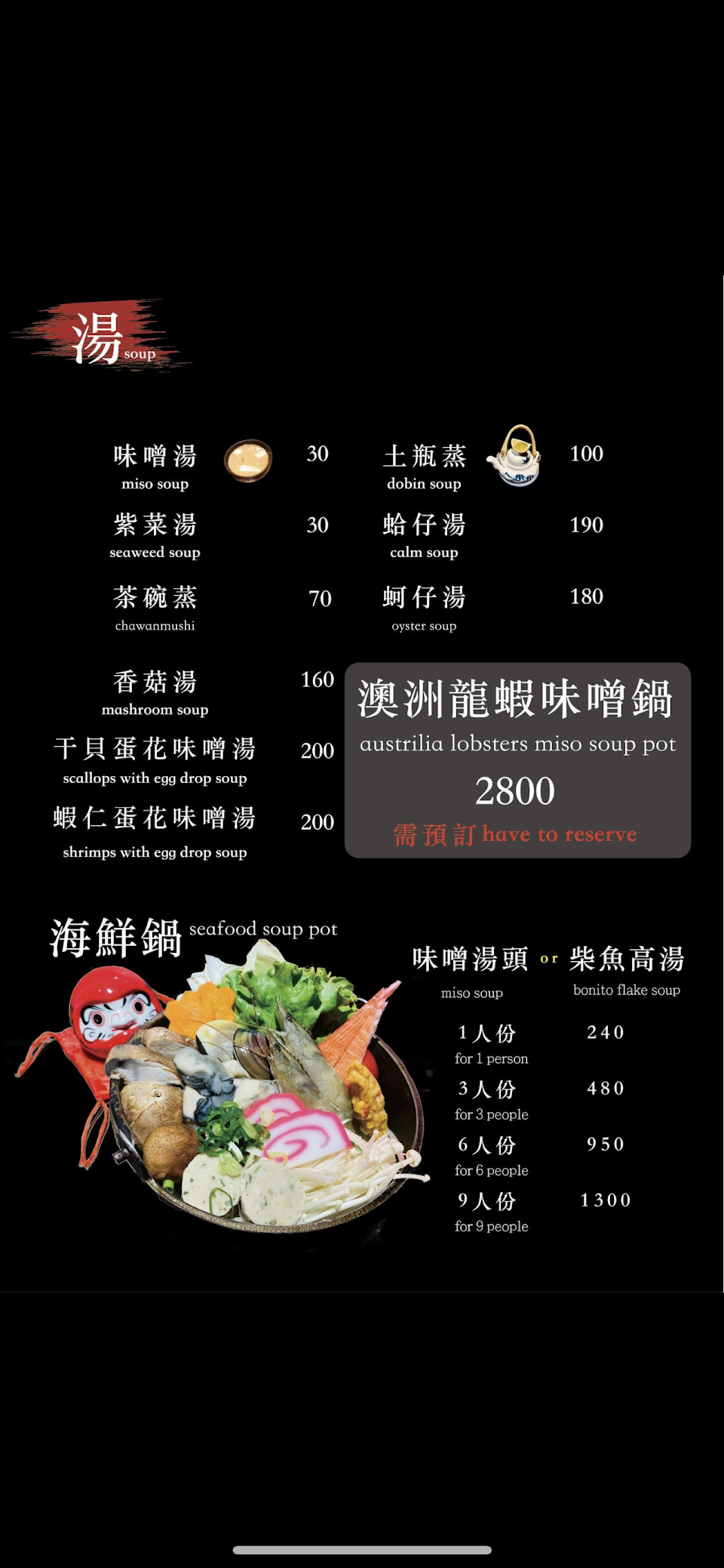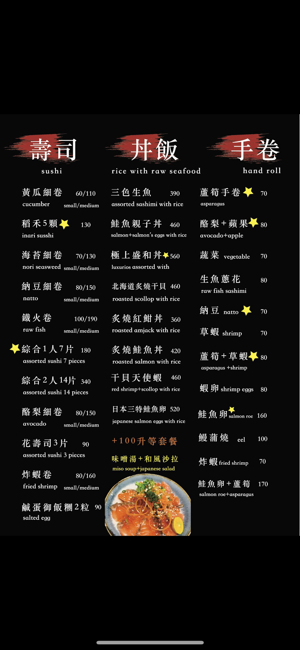 餐點好吃,但量不夠,應該是讓客人品嚐而不是吃粗飽的。環境氣氛很不錯,很有日式風… 上菜的方式稍嫌隨性,擺放盤子時直接從客人面前橫過,上餐的動線可能也因為場地座位緣故不太順… 生魚片、握壽司、手捲都很棒。 服務 內用 餐點類型 晚餐 平均每人消費金額 $400-600 餐點:4 服務:4 氣氛:4 建議的餐點 土瓶蒸 花壽司