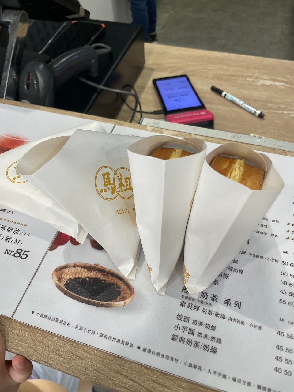 我問說芝麻奶油口味要不要等,店員跟我說後面有人要點餐。