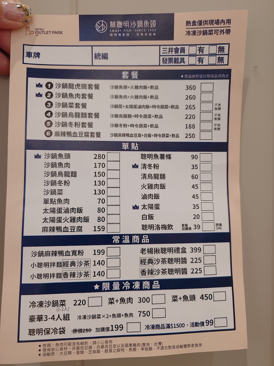 初次來到台南MITSUI OUTLET PARK,朋友推薦可以吃林聰明砂鍋魚頭~ 位在3樓的美食廣場,週日中午餐時段要排隊,不過不會等很久,點完餐即可取餐,只是動線不太順暢,要彎腰鑽過紅龍。 菜單的設計很單純,總共只有六種套餐,都是用數字來編號,可以省下點餐時間。當天6號餐賣完,我們點了3號餐跟5號餐,服務人員有提醒「3號跟5號都是沒有魚肉的」。 ❇️3沙鍋菜套餐 $265 太陽蛋滷肉飯很好吃,雖然有肥肉但我敢吃?,太陽蛋戳開拌飯一起吃,蔥花跟豬油的香氣搭配起來很讚! ❇️5沙鍋冬粉套餐 $188 飲料固定是酸梅汁,夏天滿消暑的~ 湯頭甜甜的,有一點點辣度,料很豐富,吃完很有飽足感!