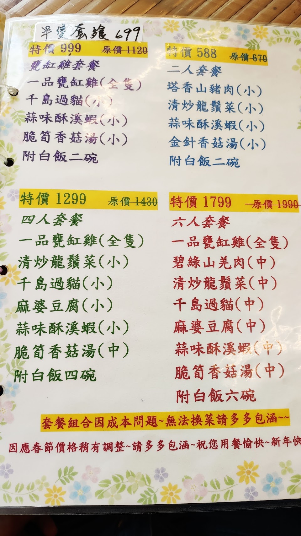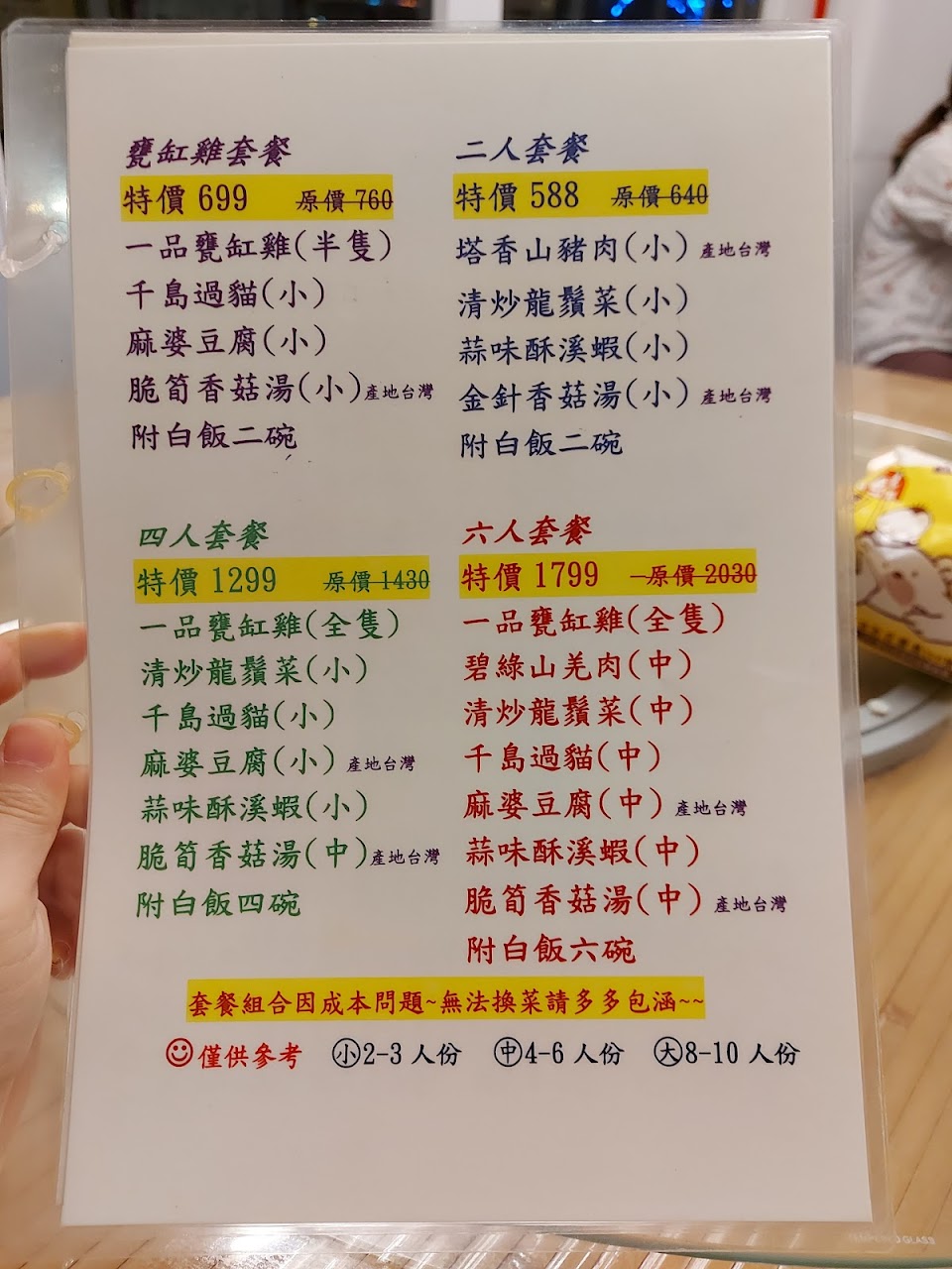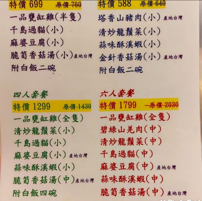 套餐6-8人份,1999元,菜色好吃,雞肉多汁又嫩,雞胸肉不會柴柴,每樣菜都很下飯,家人非常滿意。下次提早預定白斬雞試試看。