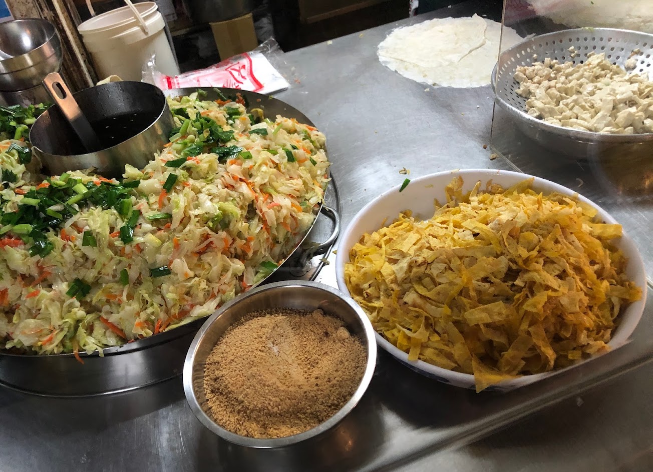 ?內餡有:豆菜麵、高麗菜炒胡蘿蔔、煎蛋絲、花生粉、豬肉、煎豆腐