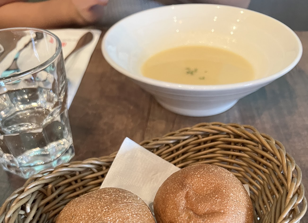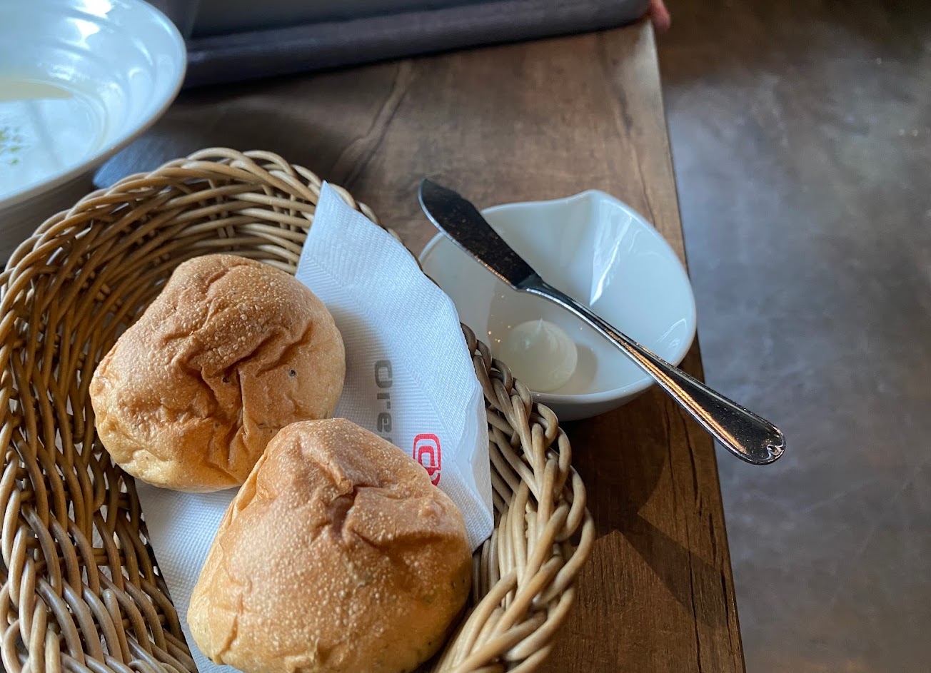 麵包就還好但烤過蠻好吃的 是迷迭香的小餐包 裡面沒包餡 同時會附上鮮奶油可以抹在上面 鮮奶油是甜的 抹在上面意外的好吃我蠻喜